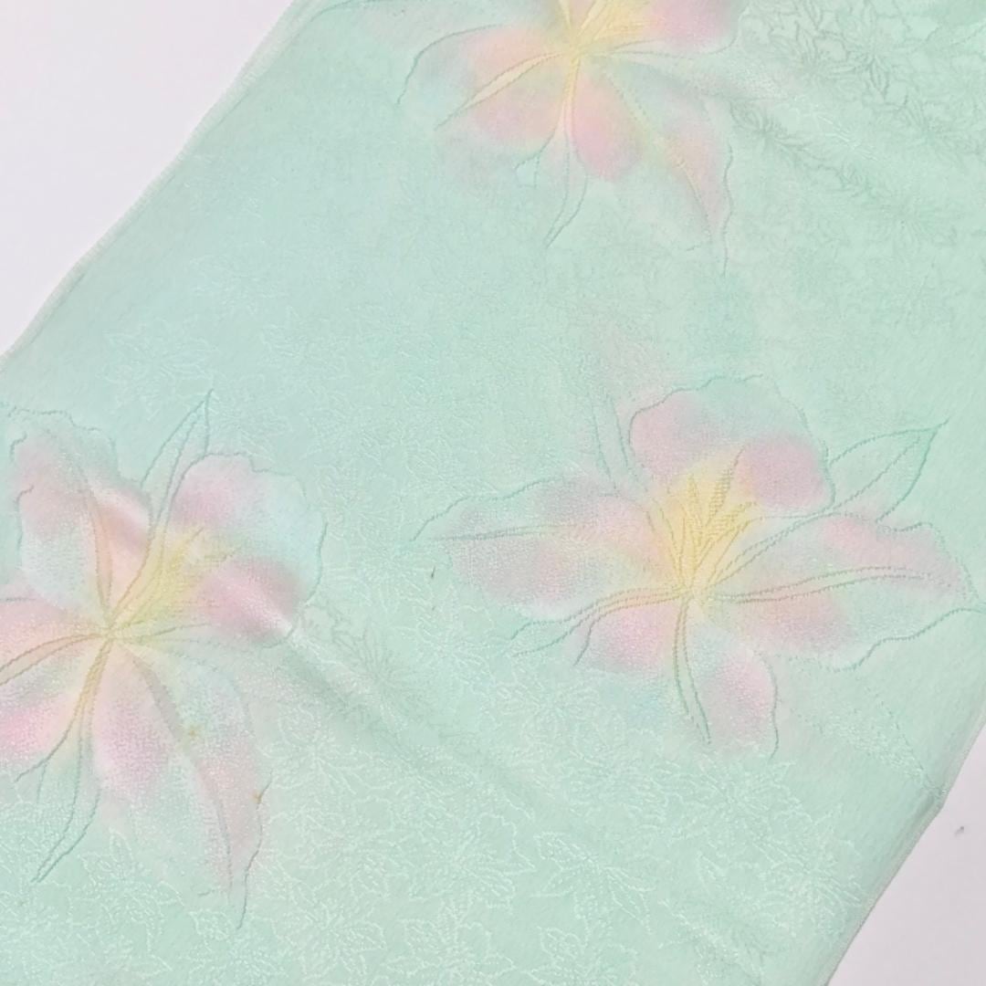 和装小物 帯揚げ 正絹 綸子 花模様 白緑色 C-6825 着物 きもの kimono 和服 和装 中古 リサイクル着物 【送料無料】