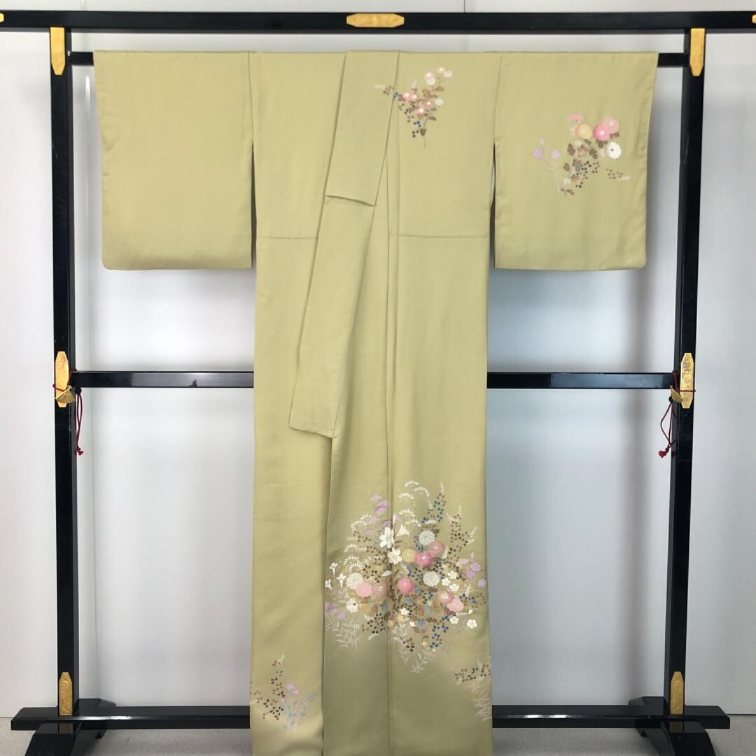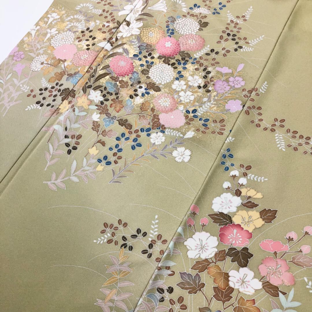 訪問着 作家物 美しい花模様 菊 萩 金銀彩 枯草色 K-5639 着物 きもの kimono 和服 和装 中古 リサイクル着物 【送料無料】