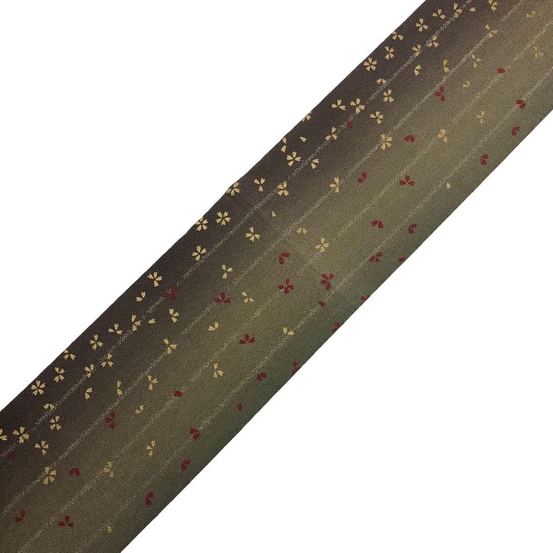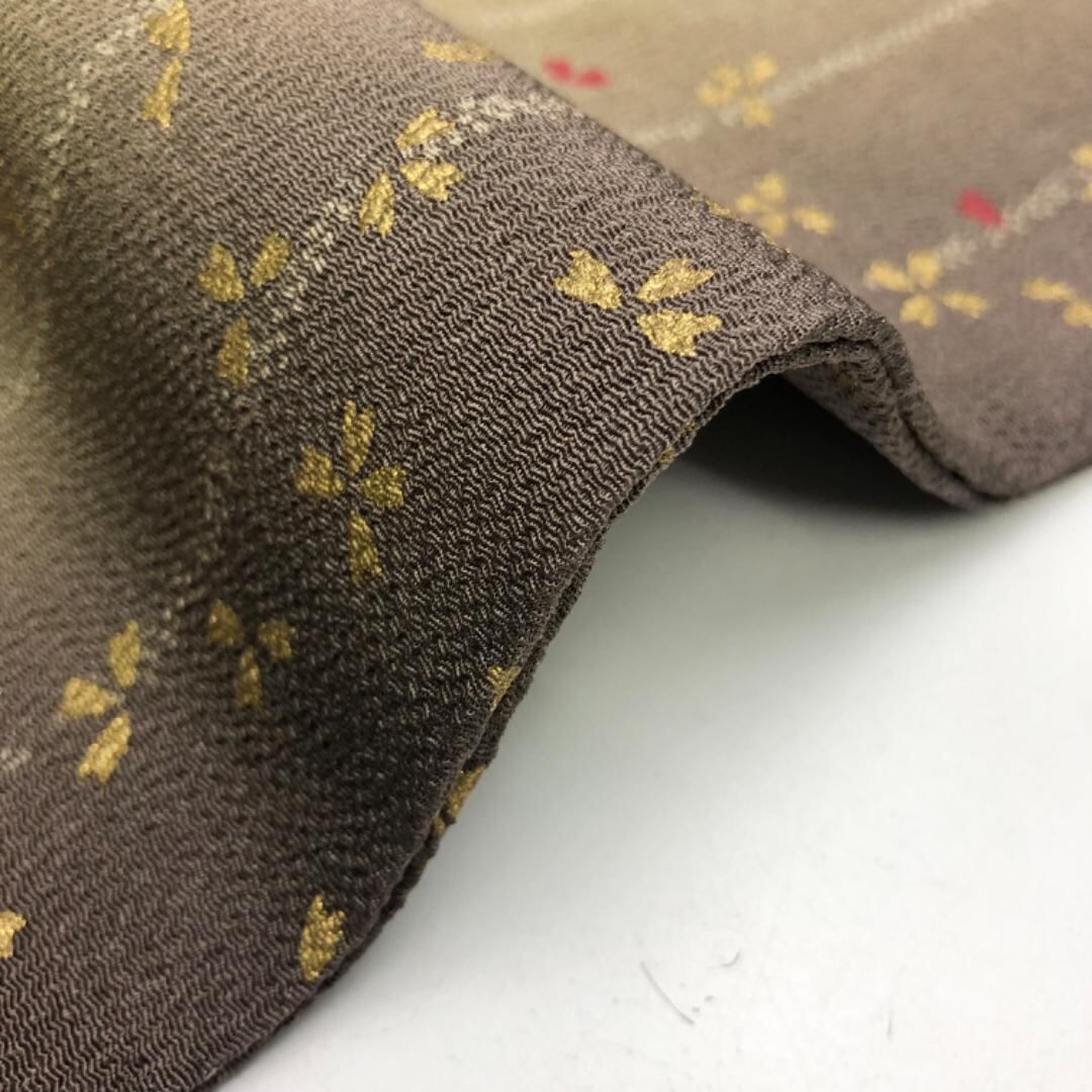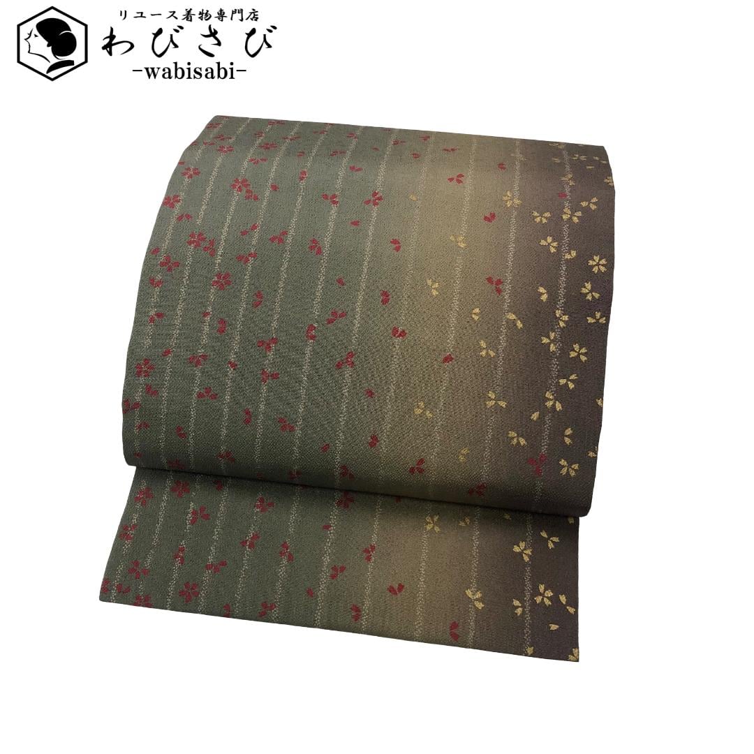 名古屋帯 桜の花びら模様 縦縞 グラデーション 縮緬 利休鼠色 O-5959 着物 きもの kimono 和服 和装 中古 リサイクル着物 【送料無料】