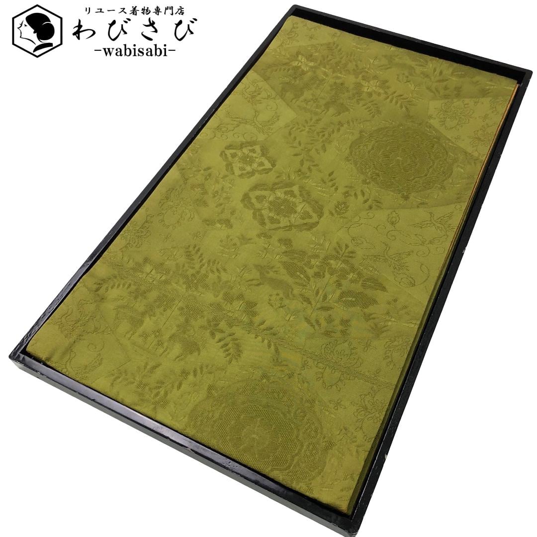袋帯 リバーシブル 鹿 鳥 花模様 青朽葉色 O-5968 着物 きもの kimono 和服 和装 中古 リサイクル着物 【送料無料】
