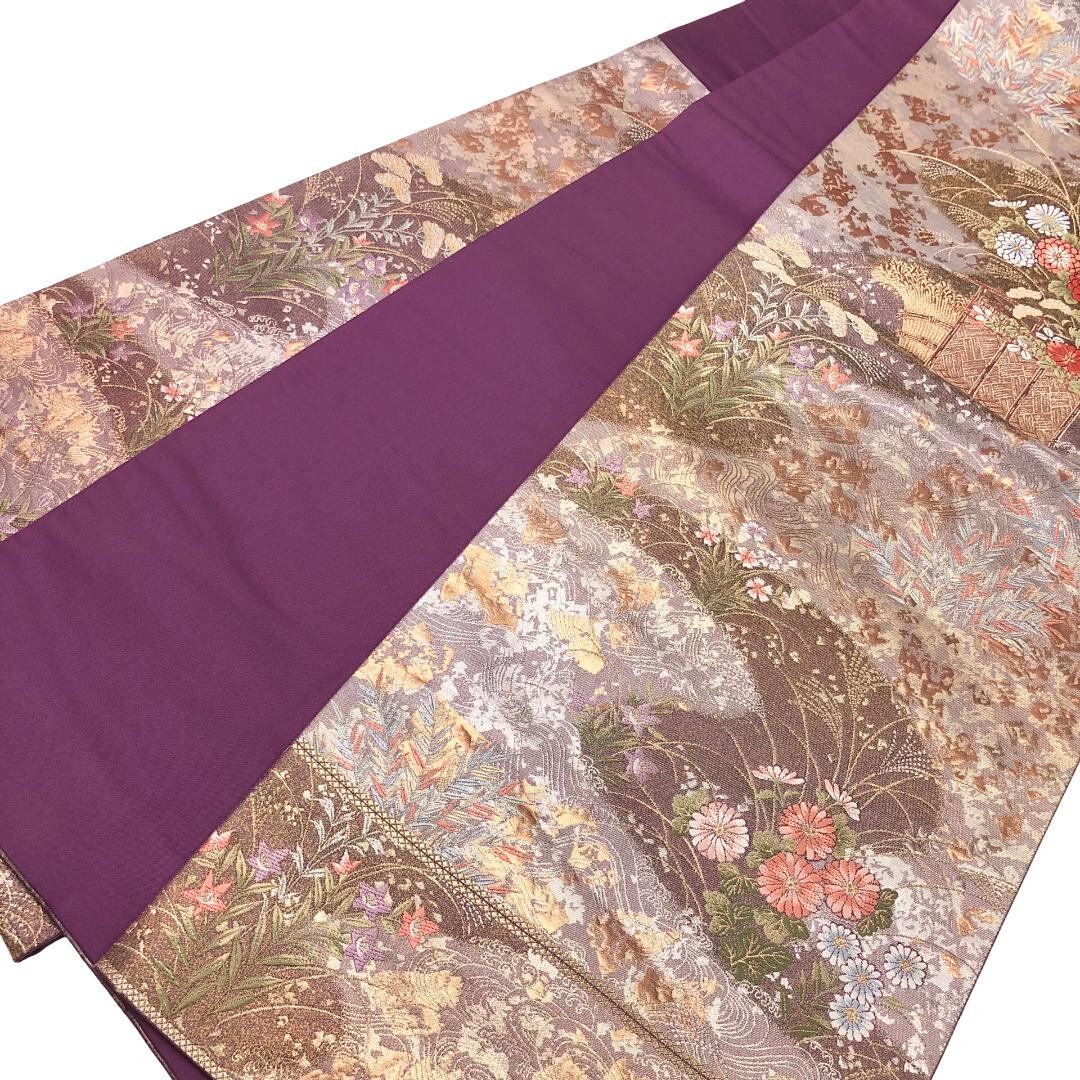 袋帯 みやび砂子文 上品な花草模様 金銀糸 古代紫色 O-5890 着物 きもの kimono 和服 和装 中古 リサイクル着物 【送料無料】