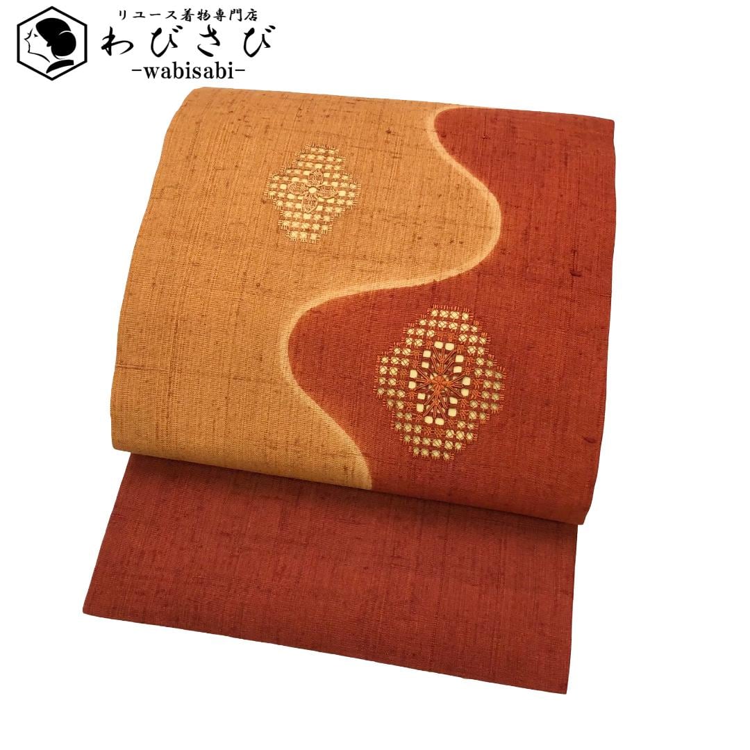 名古屋帯 紬 刺繍の花模様 染め分け 埴色 O-5944 着物 きもの kimono 和服 和装 中古 リサイクル着物 【送料無料】