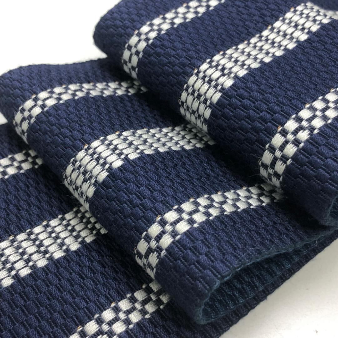 濃藍色のお色味に縦縞模様がデザインされた素敵な柄裄のお品でございます。