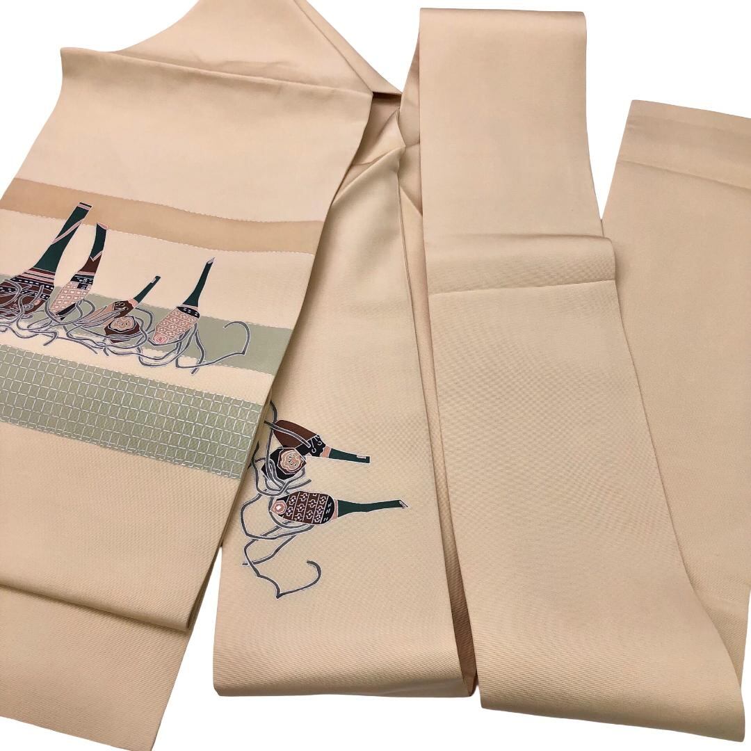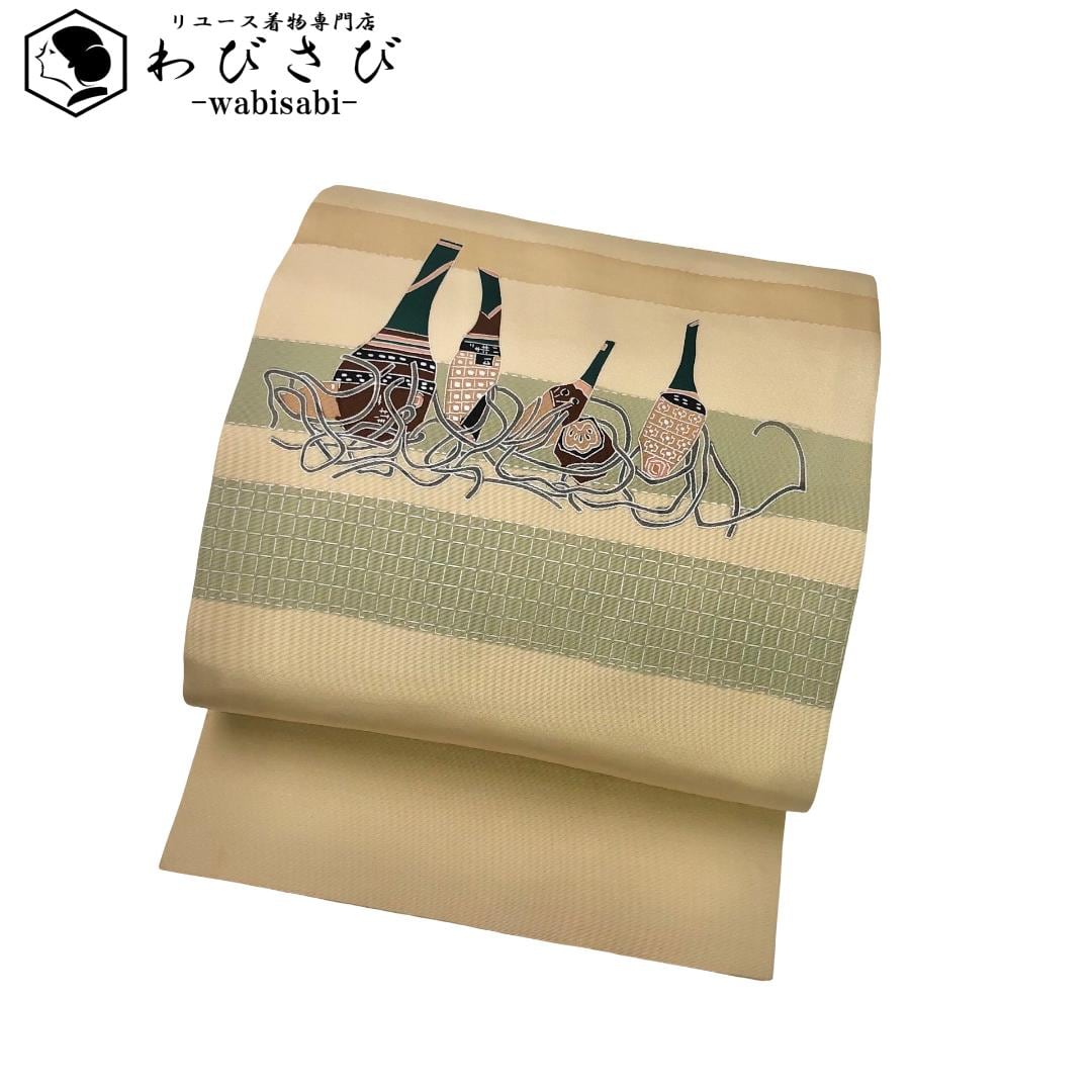 名古屋帯 塩瀬 抽象柄 薄麦藁色 O-5868 着物 きもの kimono 和服 和装 中古 リサイクル着物 【送料無料】
