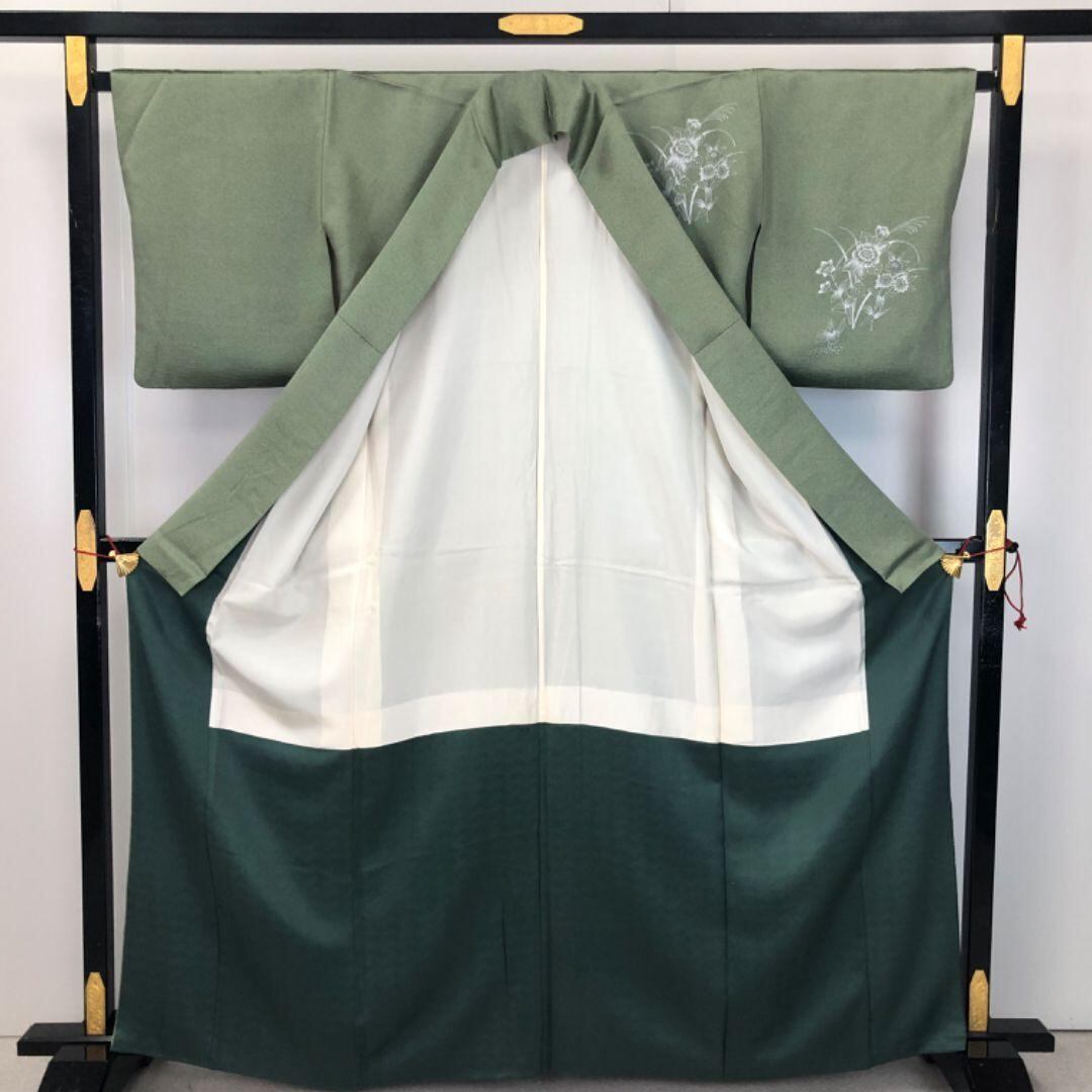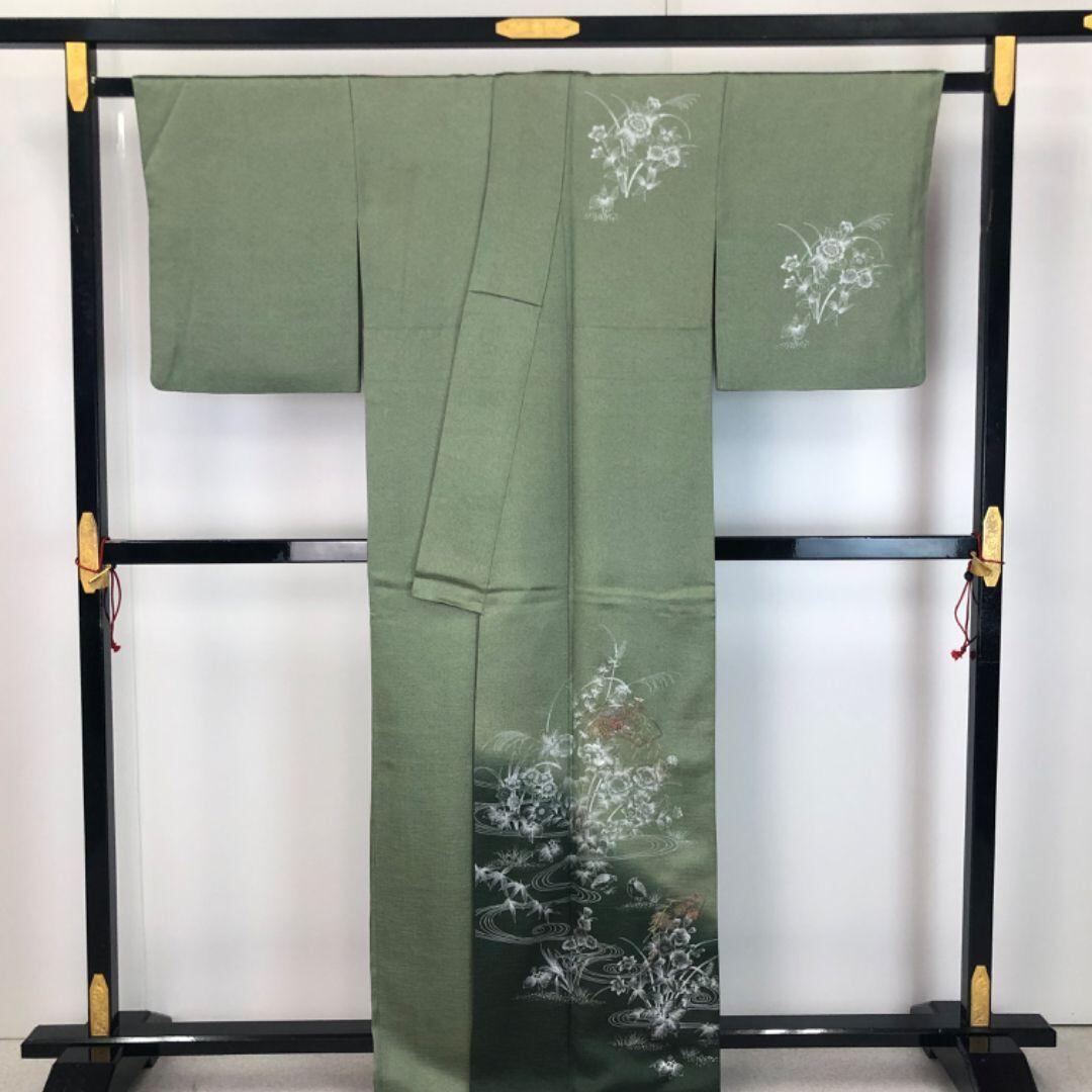付下げ 美しい花模様に流水 銀彩 地紙に花 刺繍 灰緑色 K-5643 着物 きもの kimono 和服 和装 中古 リサイクル着物 【送料無料】