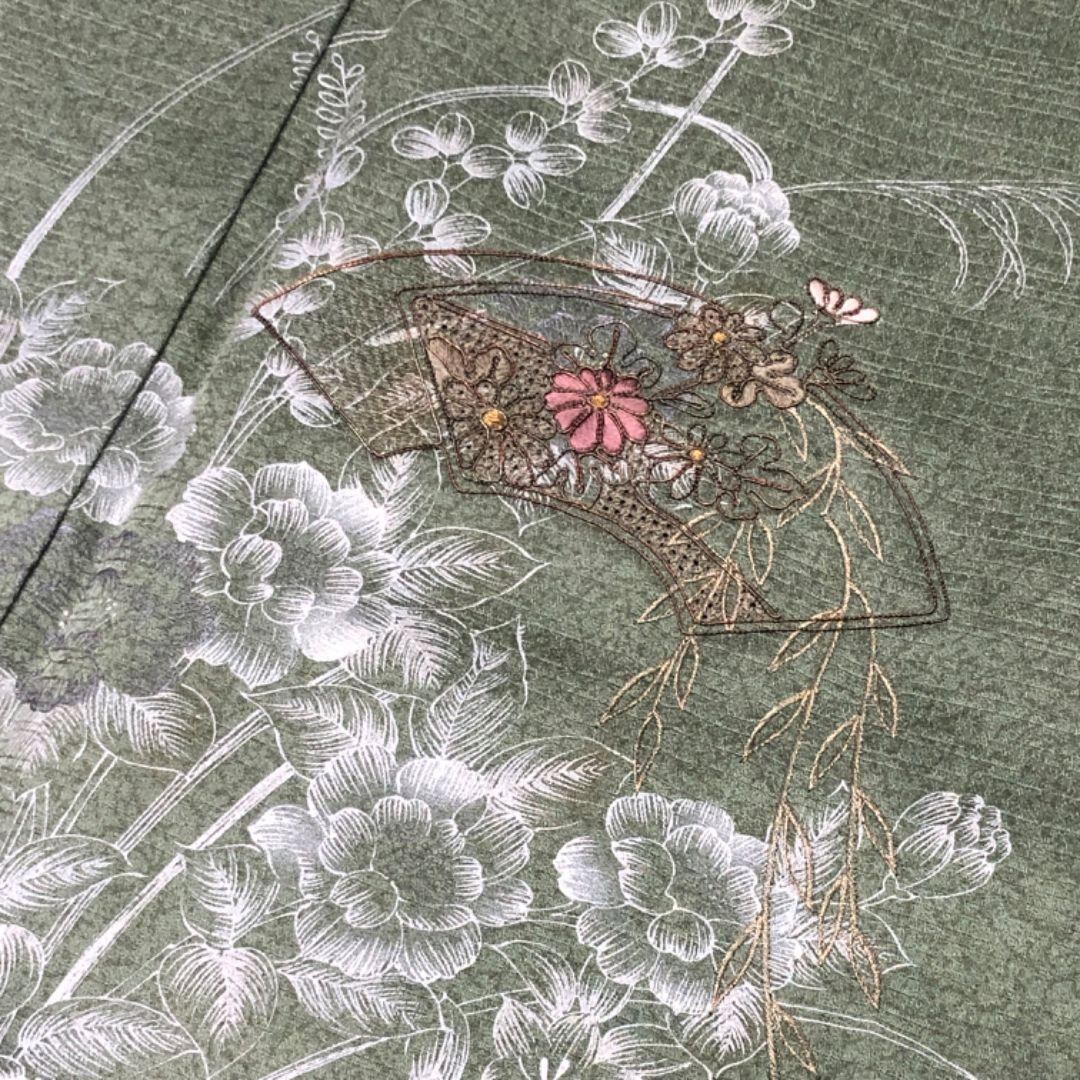 灰緑色のお色味に流水に花模様、刺繍で地紙に花の柄裄がデザインされた素敵なお品でございます。