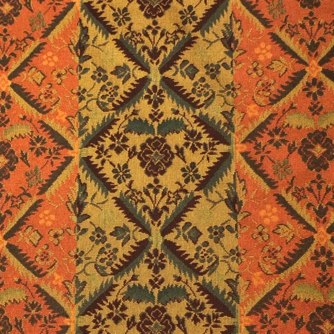 橙色ベースのお色味に縦縞、花柄模様がデザインされた素敵な柄裄のお品でございます。