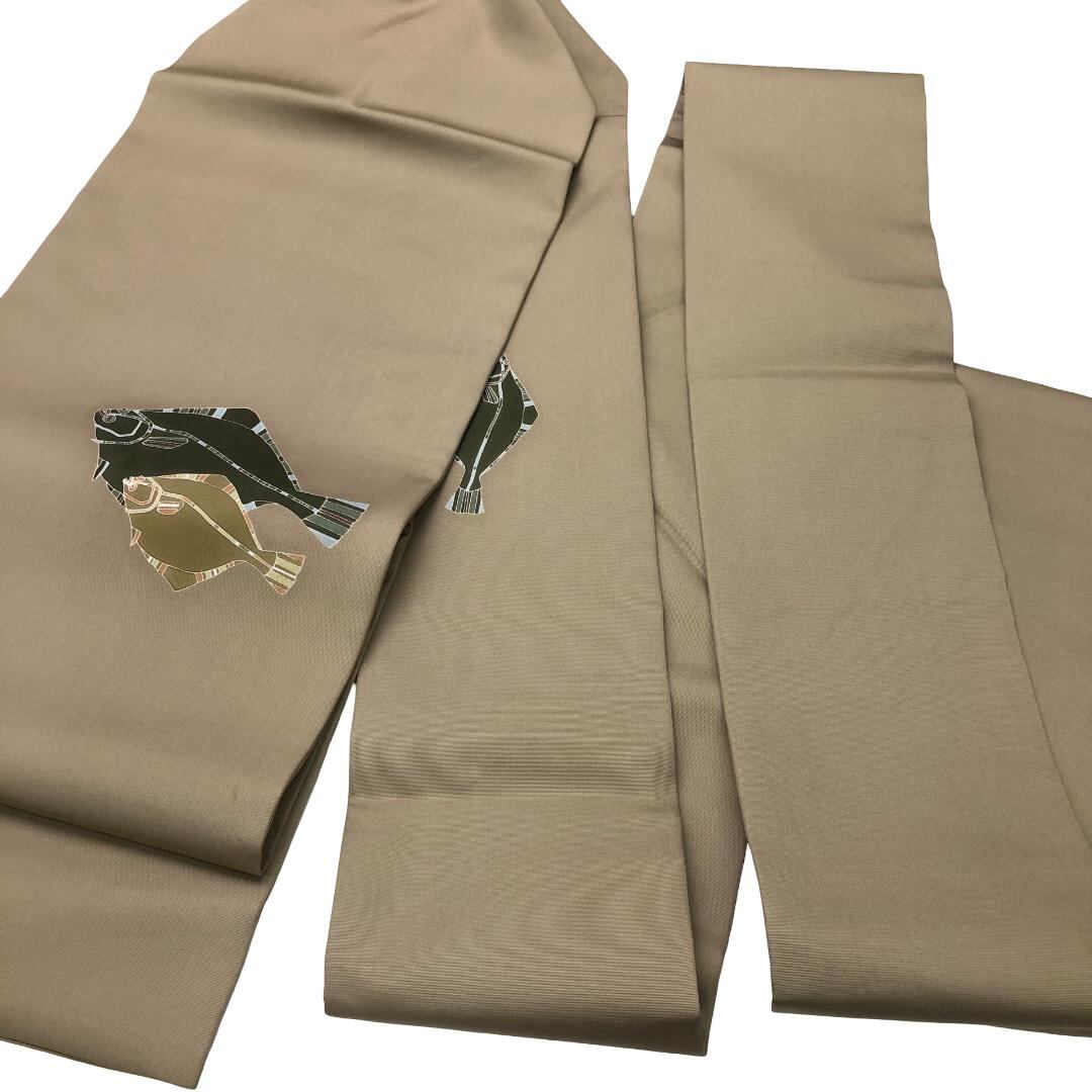 名古屋帯 塩瀬 魚柄 鮃 ひらめ 亜麻色 O-5925 着物 きもの kimono 和服 和装 中古 リサイクル着物 【送料無料】