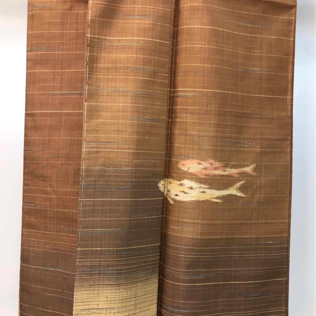 古銅色ベースの漢方草木染の落ち着きのあるお色味に魚の柄裄がデザインされた雰囲気の良い素敵なお品でございます。