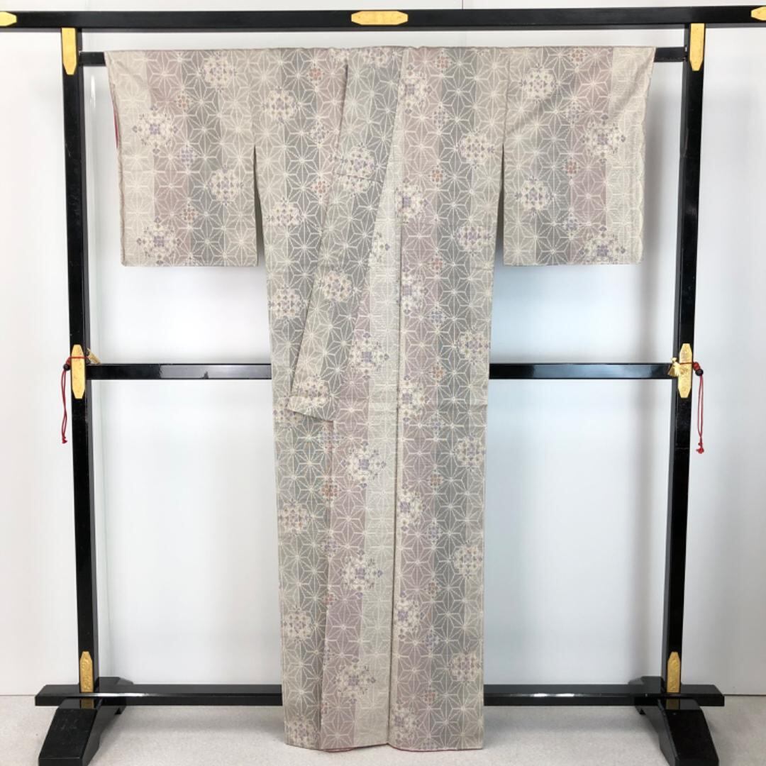 紬着物 麻の葉に華柄模様 乳白色 K-5679 着物 きもの kimono 和服 和装 中古 リサイクル着物 【送料無料】