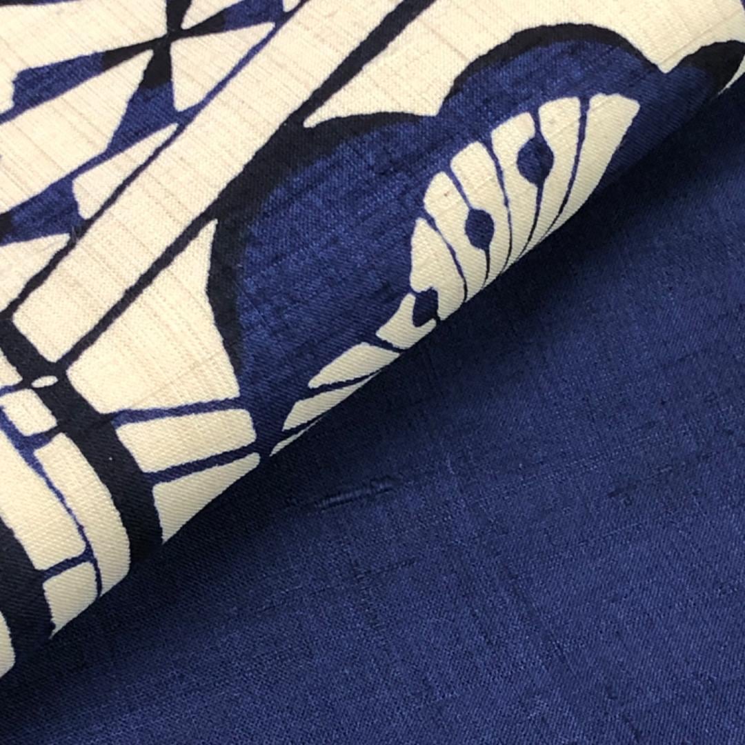 紺色のお色味に雰四角に抽象花模様がデザインされた囲気の良い素敵なお品でございます。