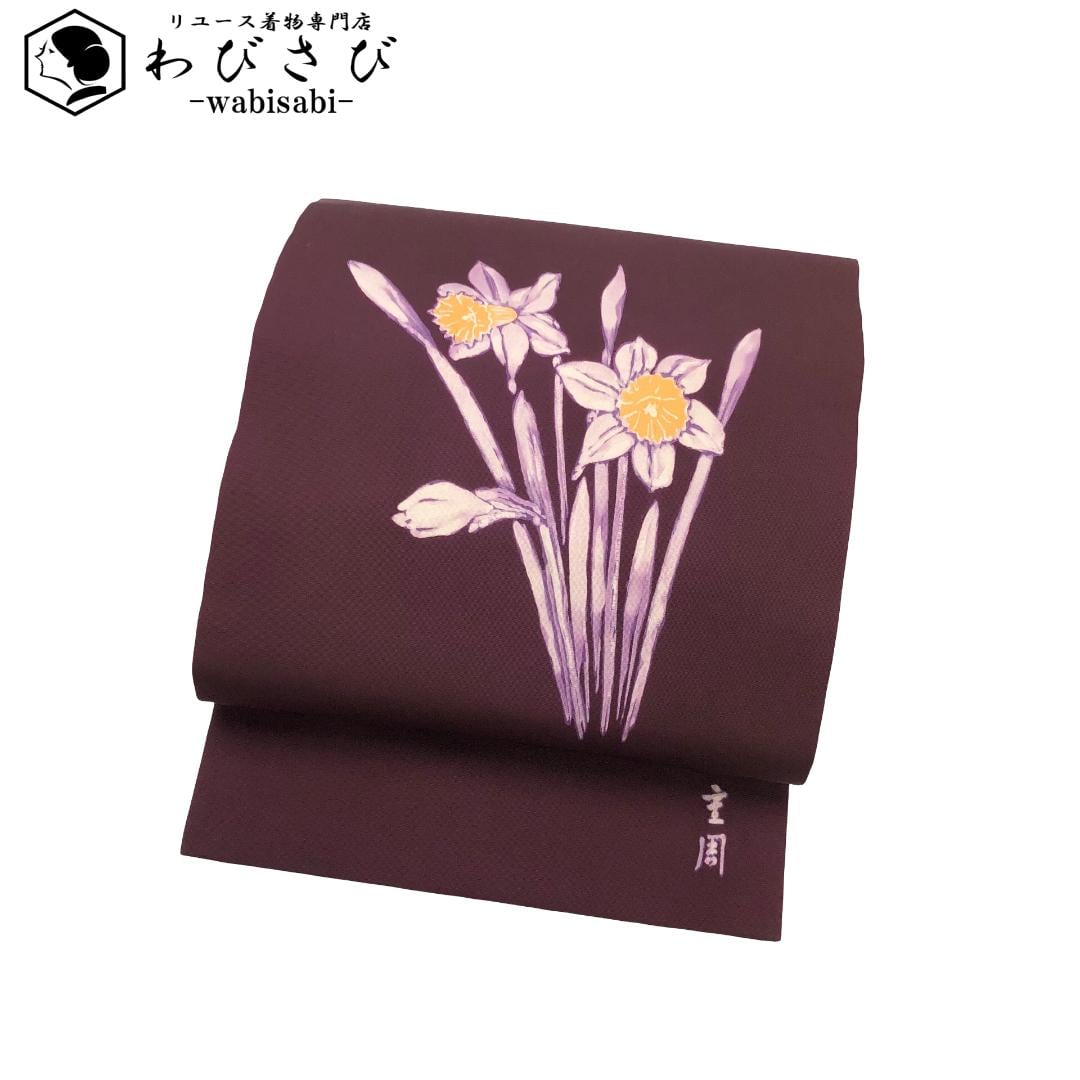 名古屋帯 作家物 塩瀬 水仙の花 葡萄茶色 O-5987 着物 きもの kimono 和服 和装 中古 リサイクル着物 【送料無料】