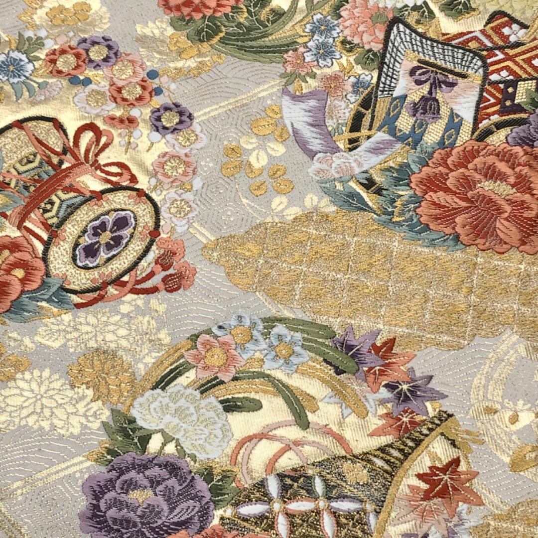 胡粉色のお色味に美しい花模様、 御所車に鼓などの柄裄がデザインされた素敵なお品でございます。