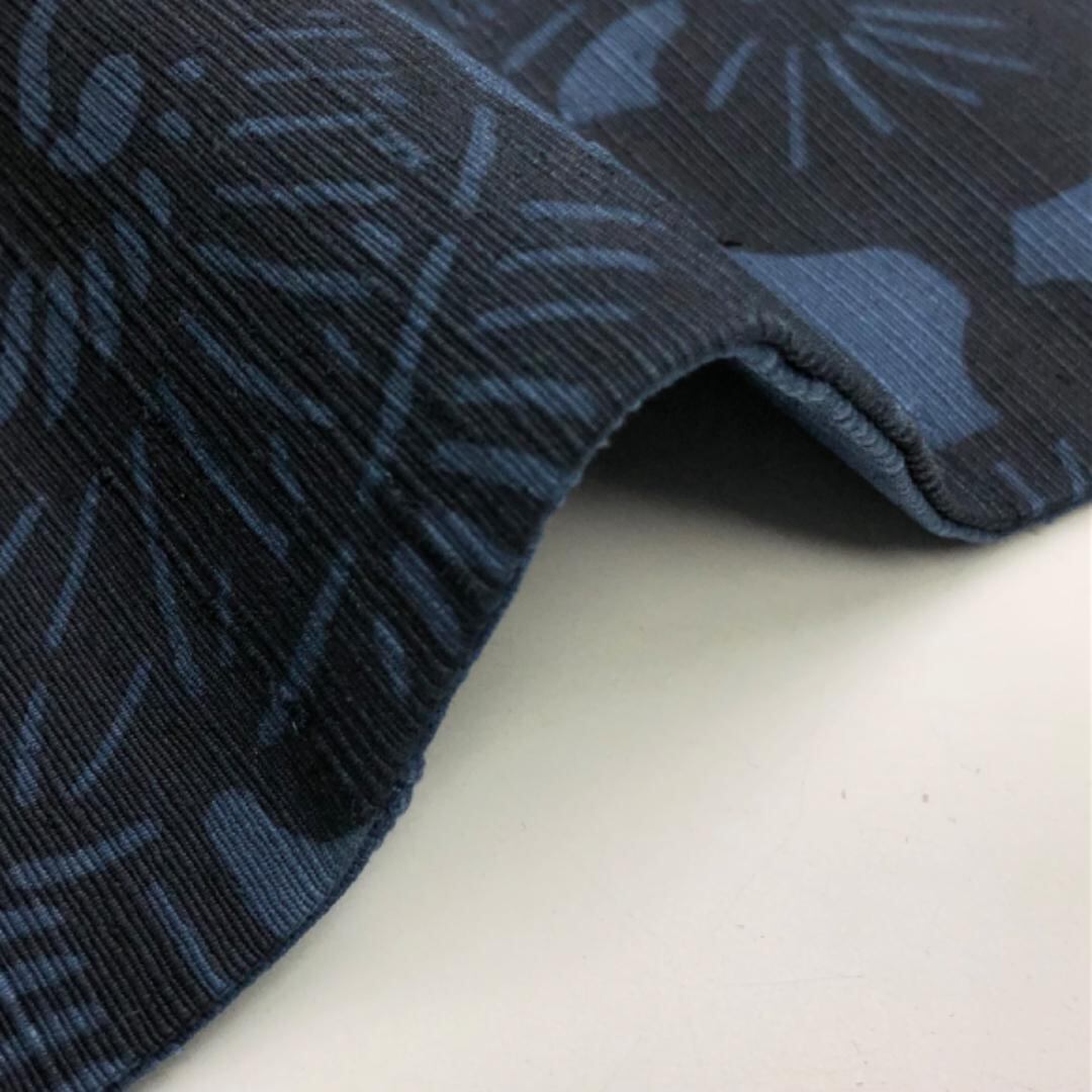 濃二藍色のお色味の紬地に唐草模様の雰囲気の良い型染の柄行がデザインされた素敵なお品でございます。