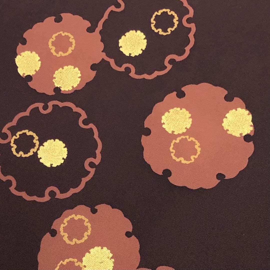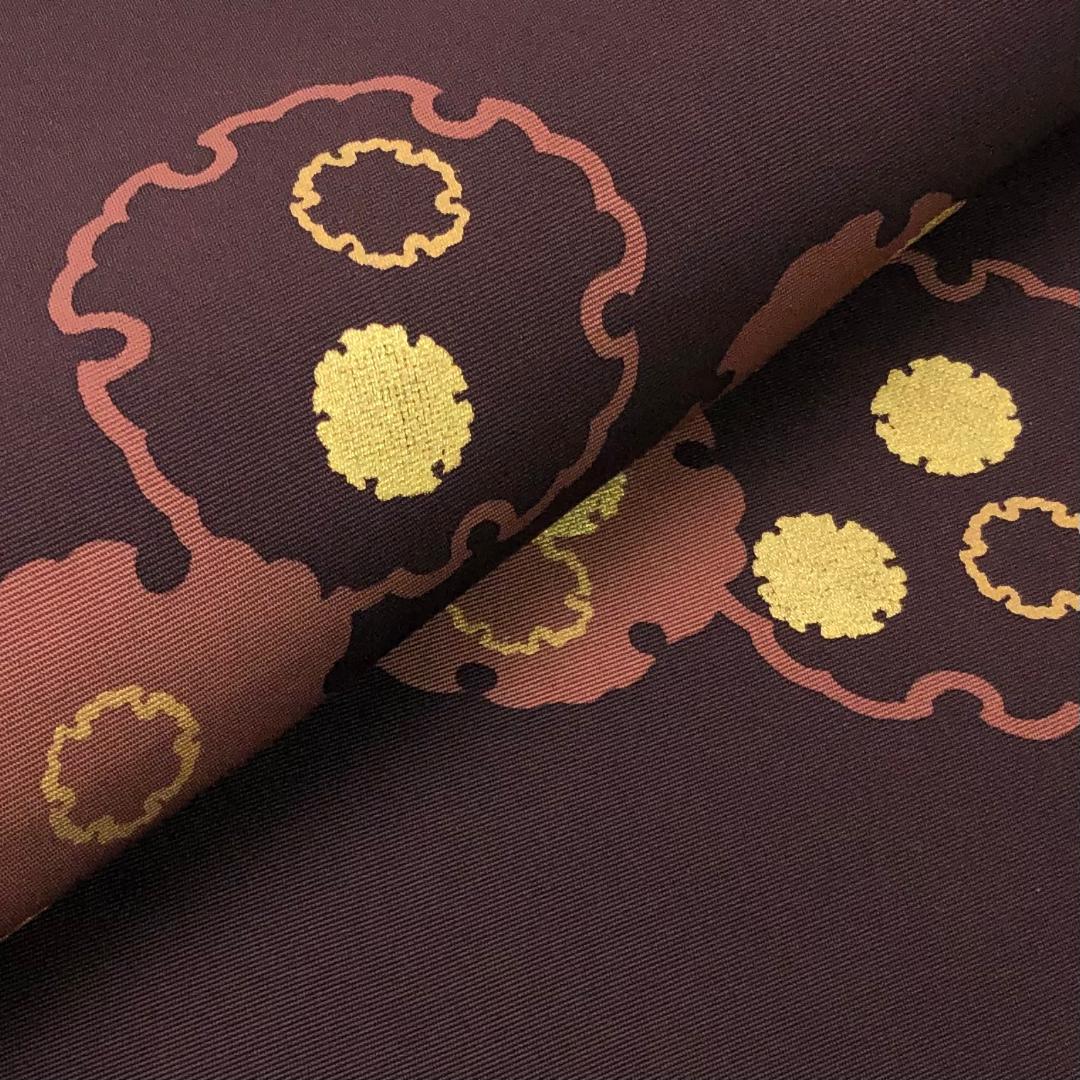 臙脂墨色の落ち着いたお色味に可愛らしい雪輪模様がデザインされた素敵なお品でございます。