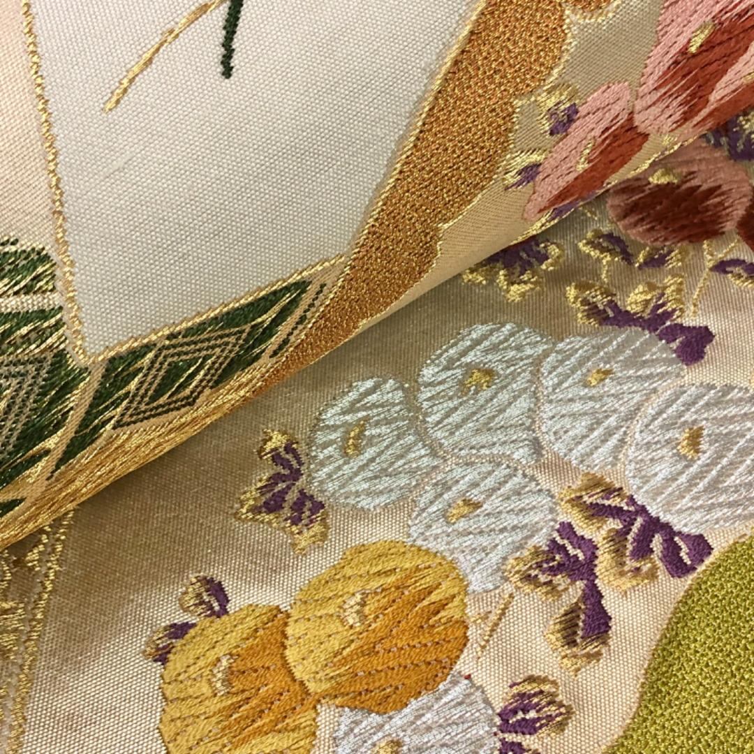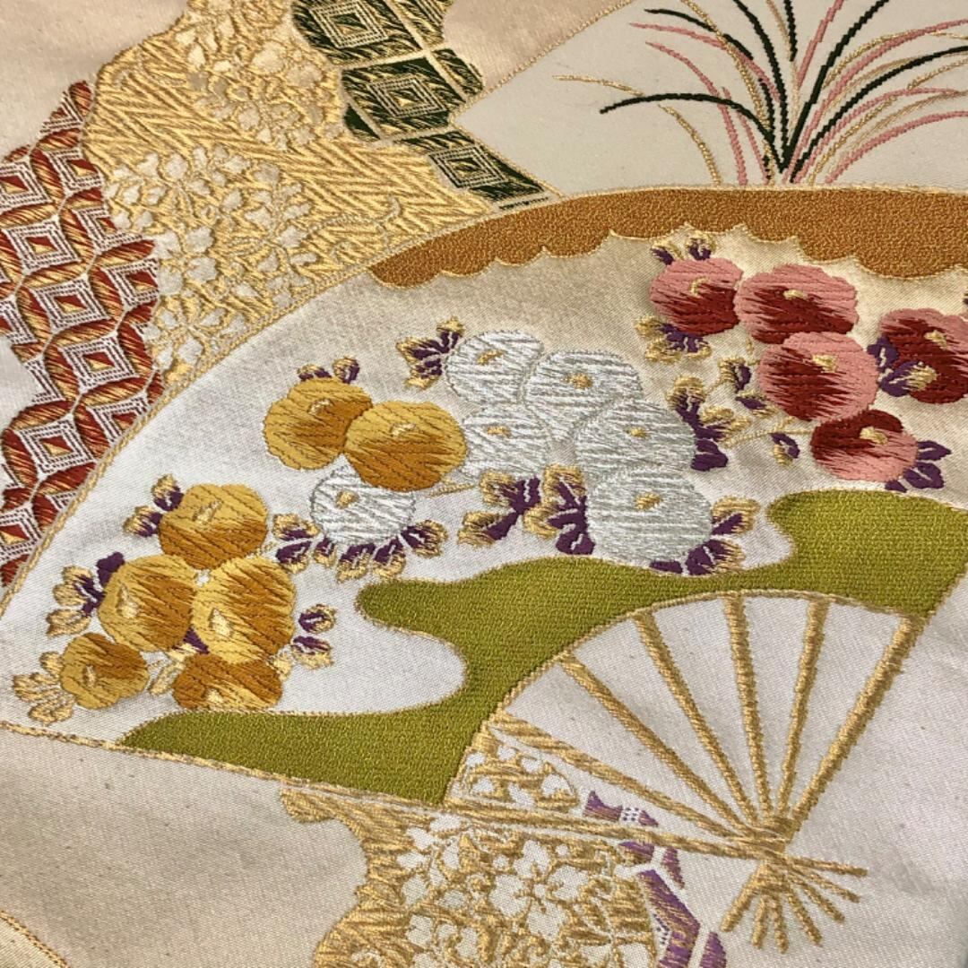 袋帯 扇子に花模様 道長取り 亀甲 砥粉色 金銀糸 O-5895 着物 きもの kimono 和服 和装 中古 リサイクル着物 【送料無料】