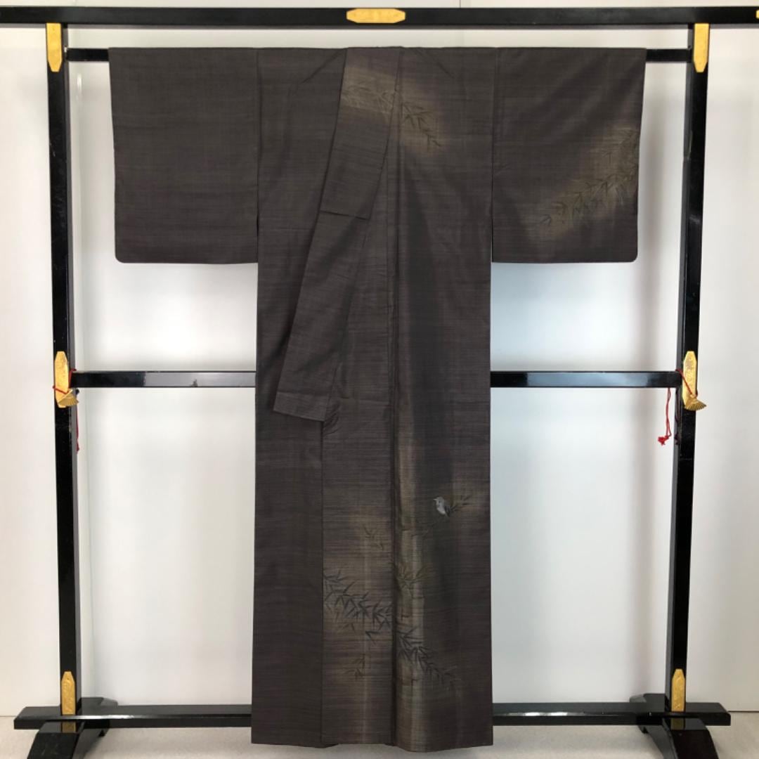 純泥染の落ち着いたお色味に笹竹に雀の柄行がデザインされた雰囲気の良い素敵なお品でございます。