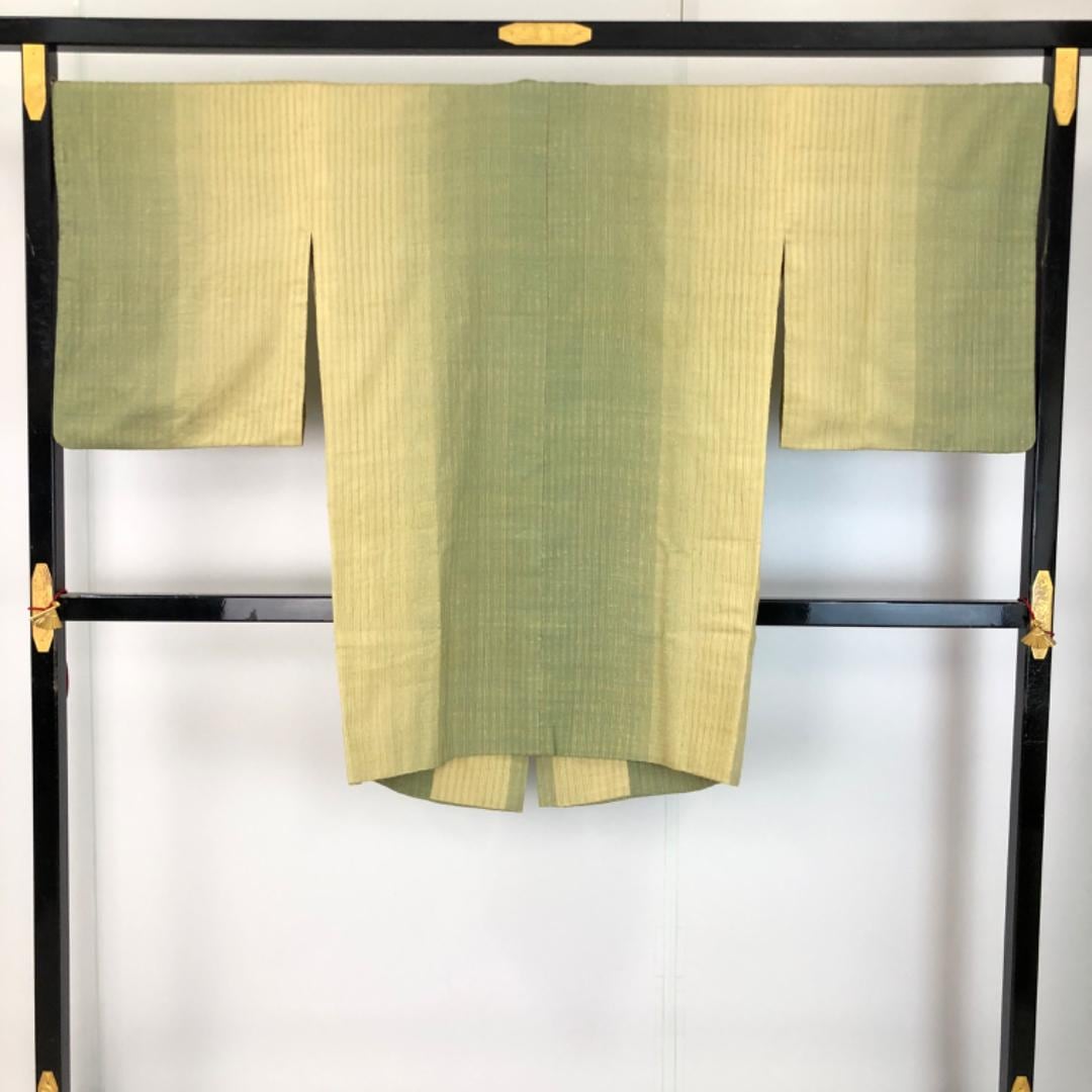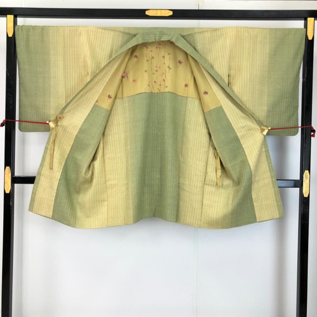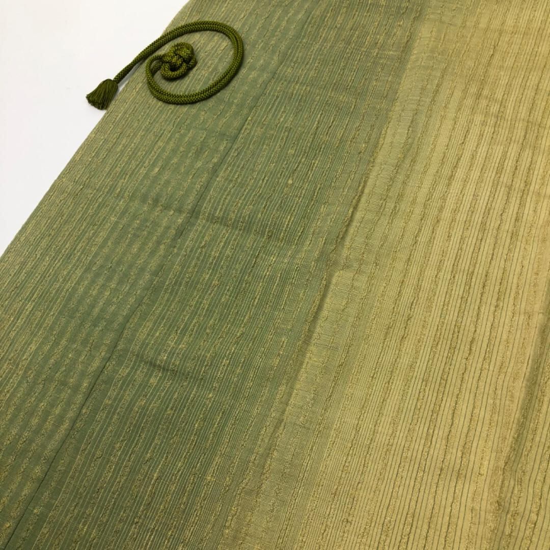 柳茶色ベースのお色味に縦縞グラデーション模様がデザインされた雰囲気の良い素敵なお品でございます。