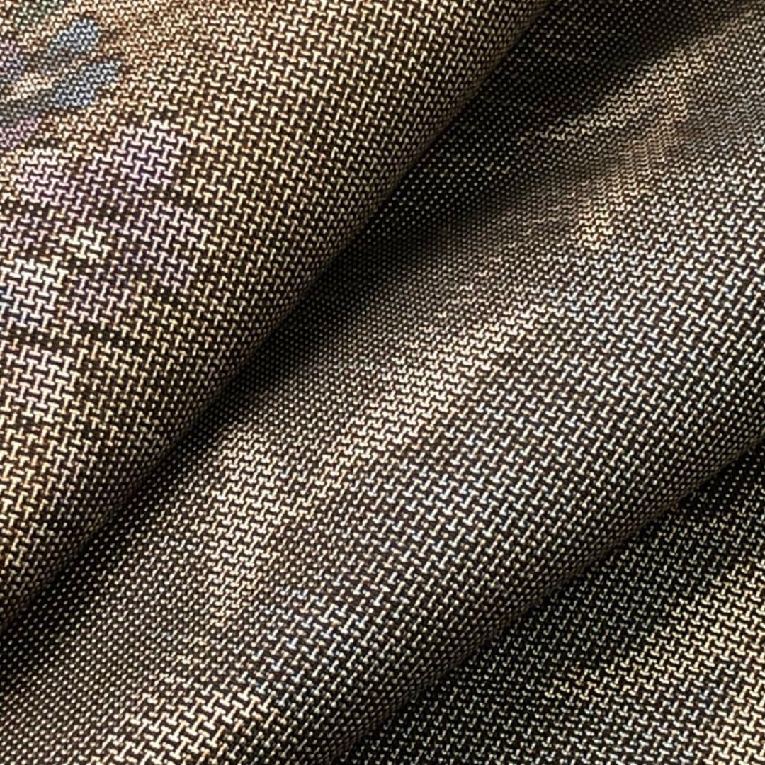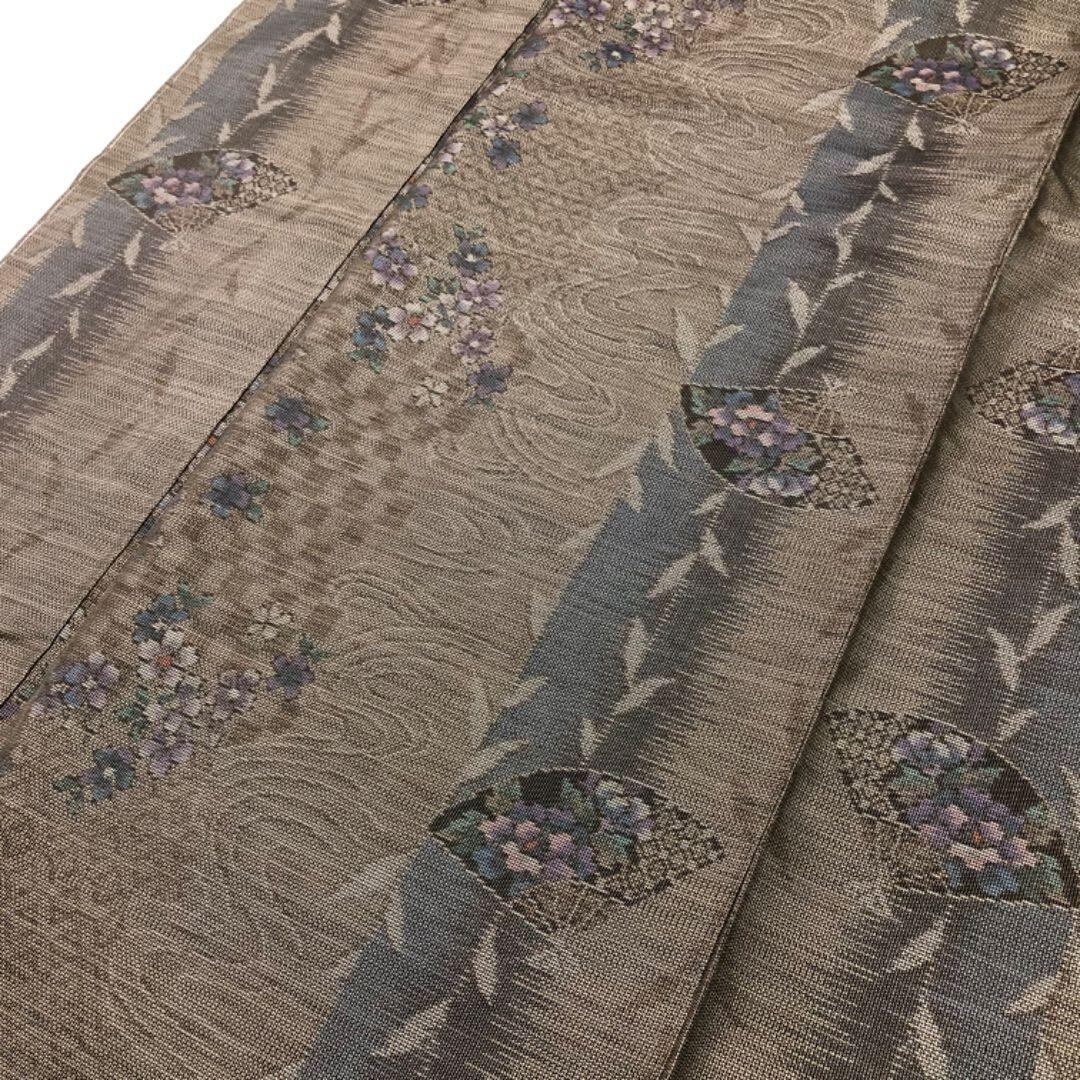純泥染の落ち着きあるお色味に美しい絣模様、縦柄の花模様、扇子などがデザインされた雰囲気の良い素敵なお品でございます。