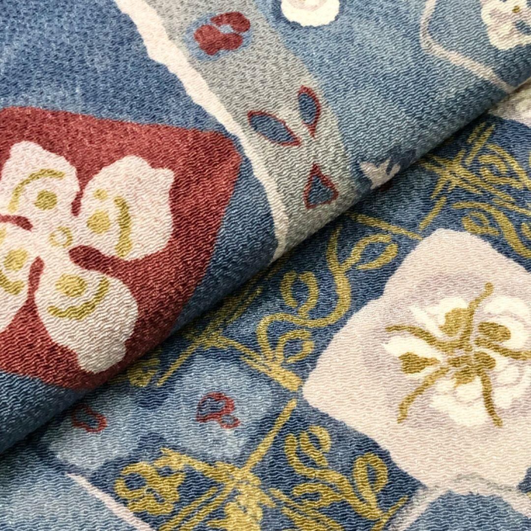 水鼠色ベースの品のあるお色味に四角に花模様がデザインされた雰囲気の良い素敵なお品でございます。