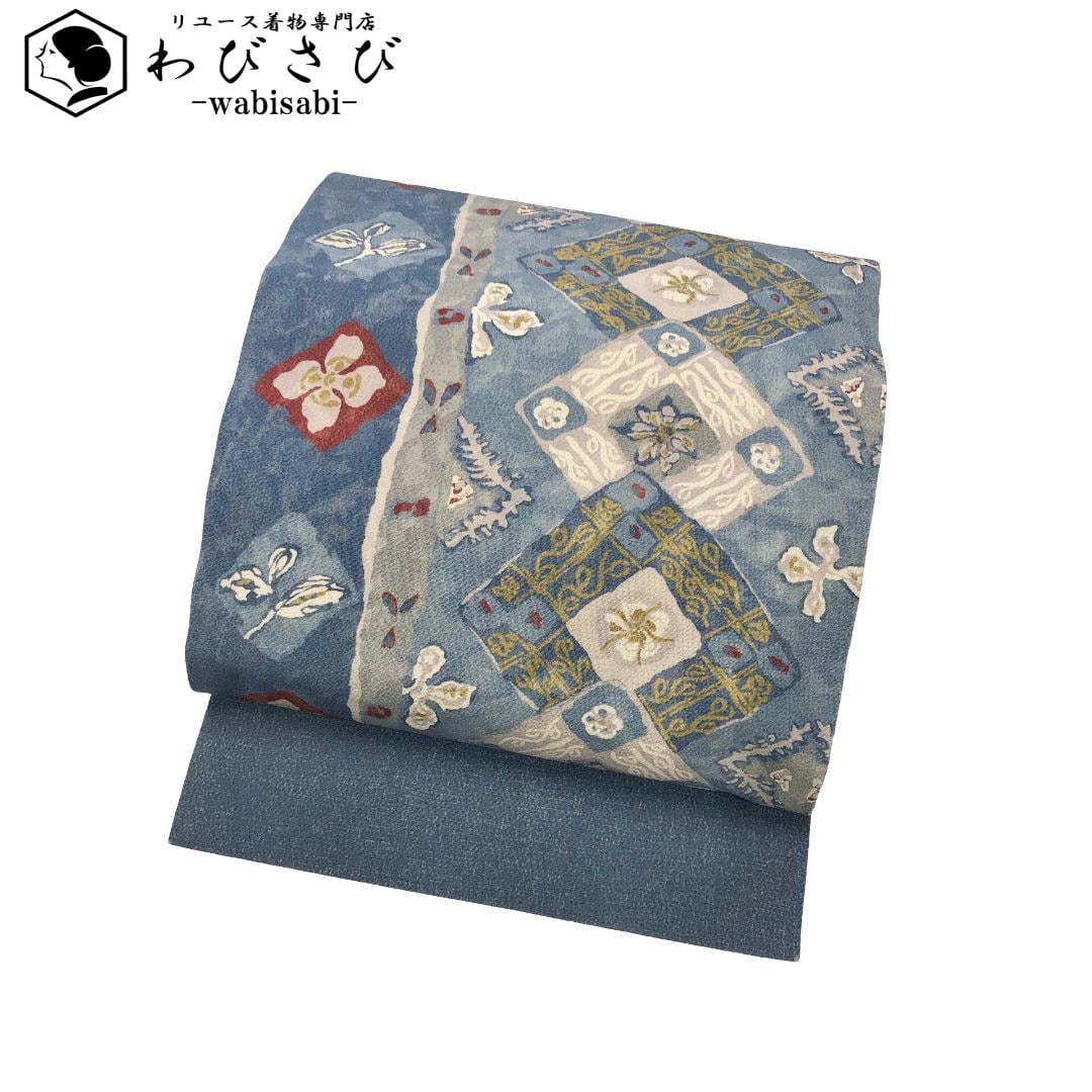 名古屋帯 四角に花模様 水鼠色 縮緬 O-5997 着物 きもの kimono 和服 和装 中古 リサイクル着物 【送料無料】