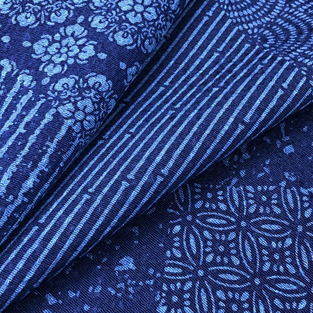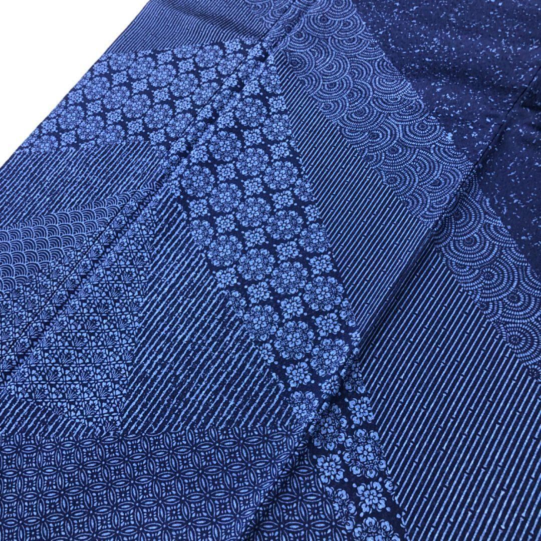 濃藍色の美しい藍染のお色味に叩き染、花七宝に青海波などの雰囲気の良い柄がデザインされた素敵なお着物でございます。