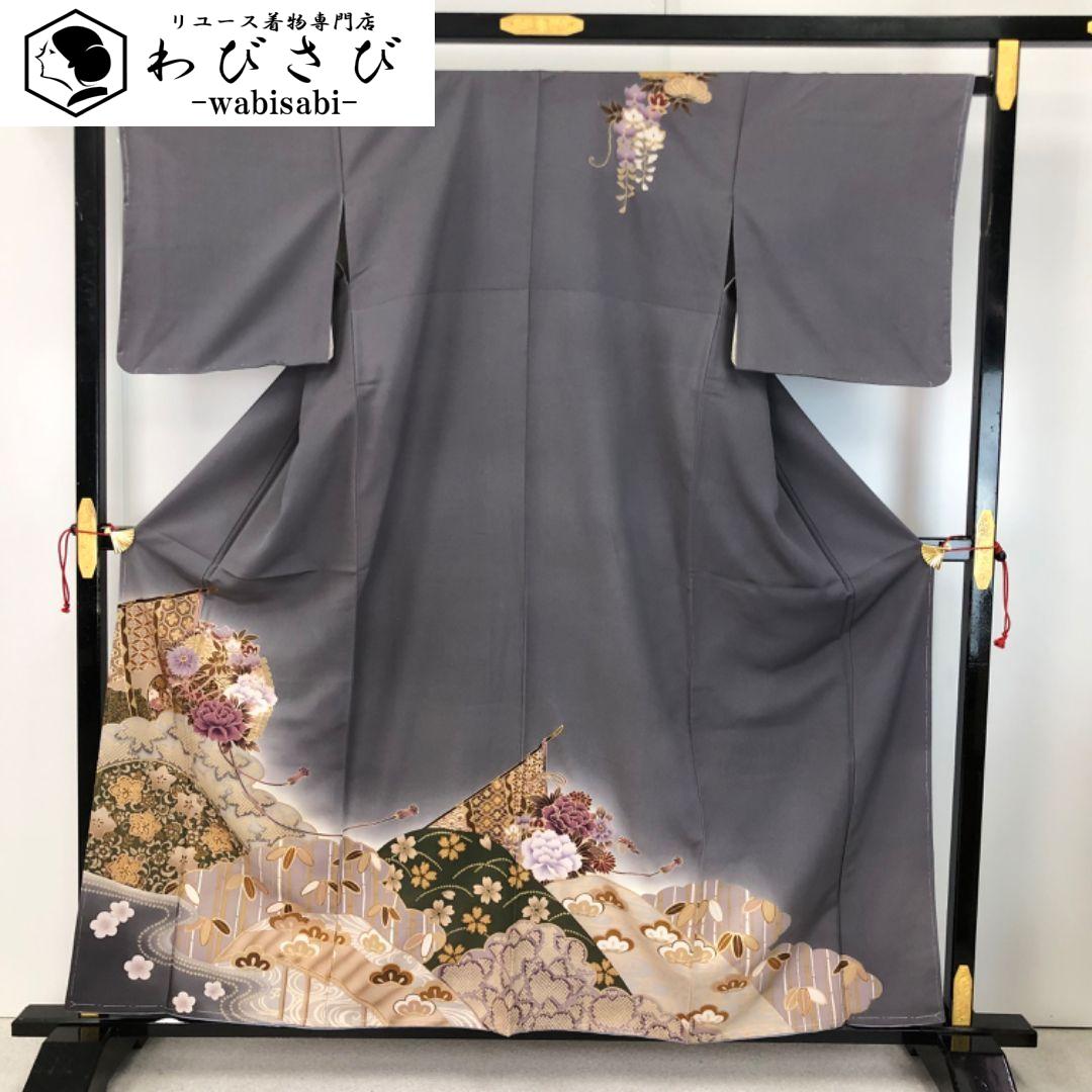 訪問着 鼓に花模様 組紐 花七宝 金彩 藤煤竹色 K-5720 着物 きもの kimono 和服 和装 中古 リサイクル着物 【送料無料】