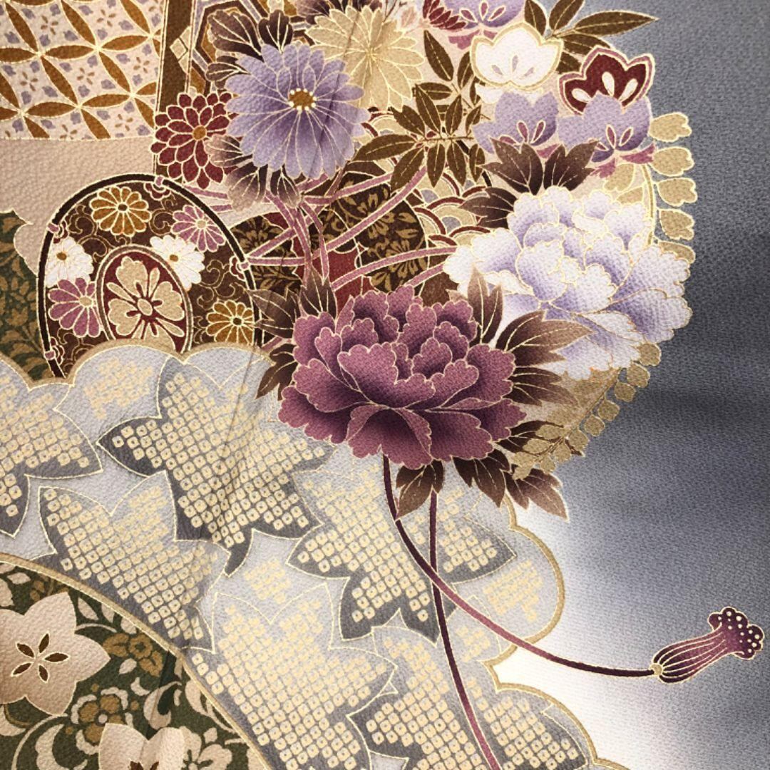 藤煤竹色のお色味に鼓に花模様などの品のある柄裄がデザインされた素敵なお品でございます。