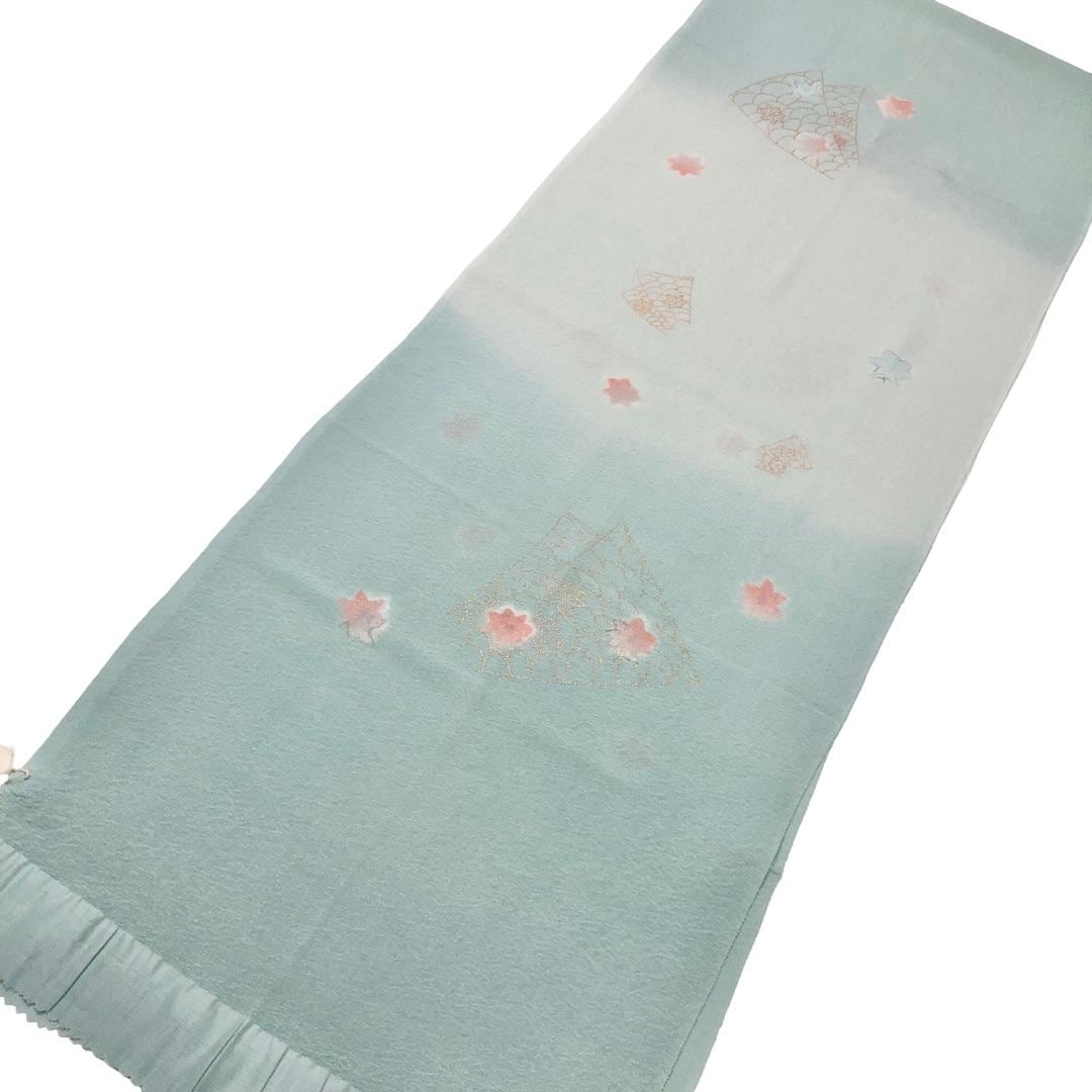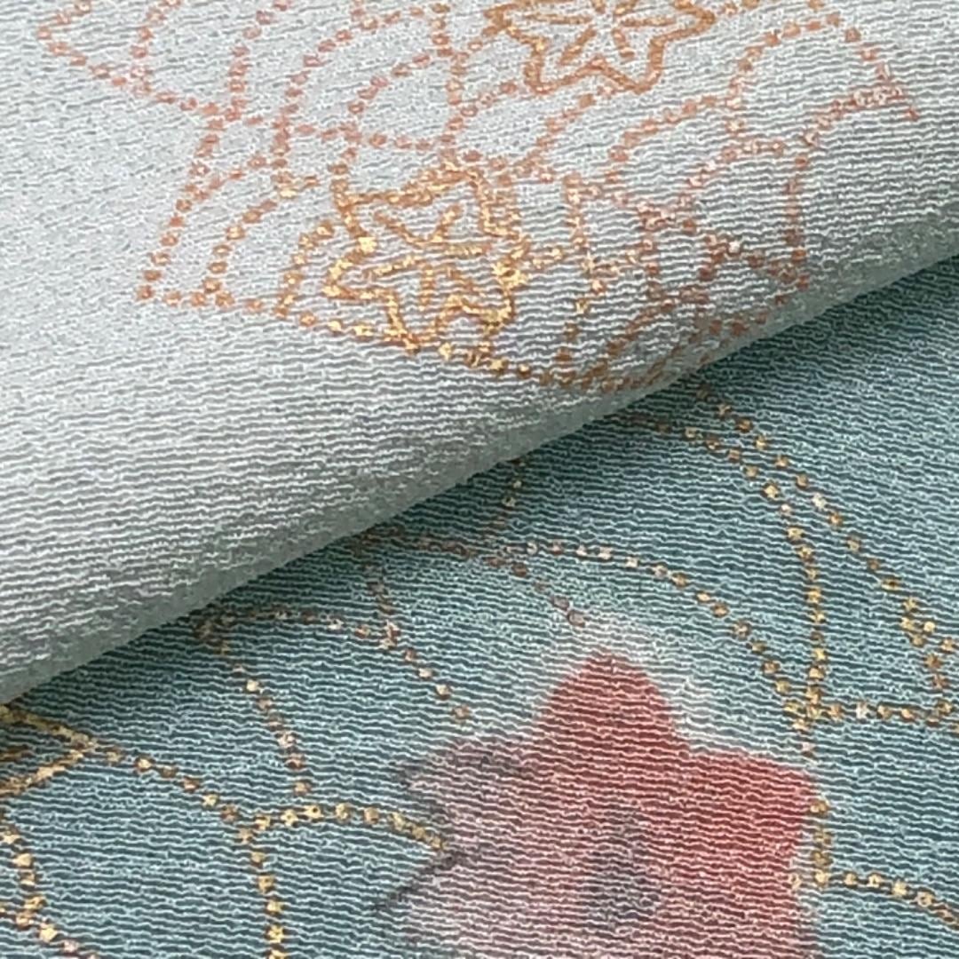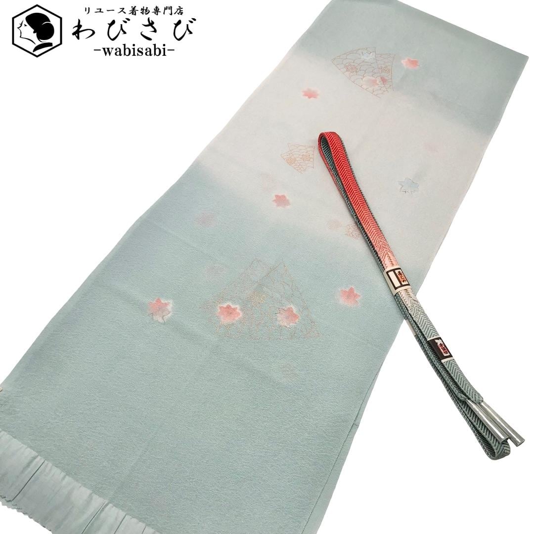 薄水色ベースのお色味に綸子の帯揚げ、平組紐の帯締めの素敵なお品でございます。