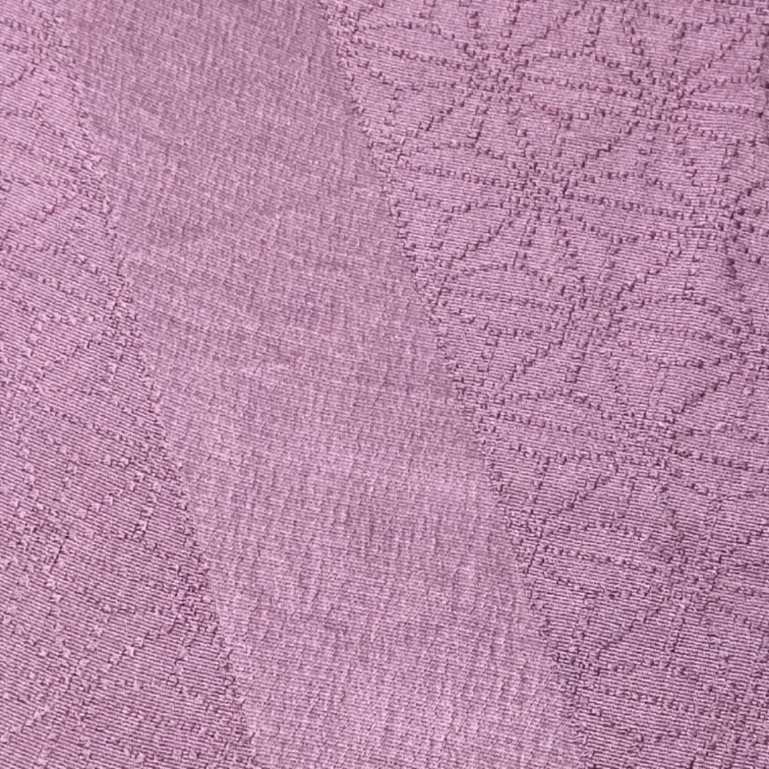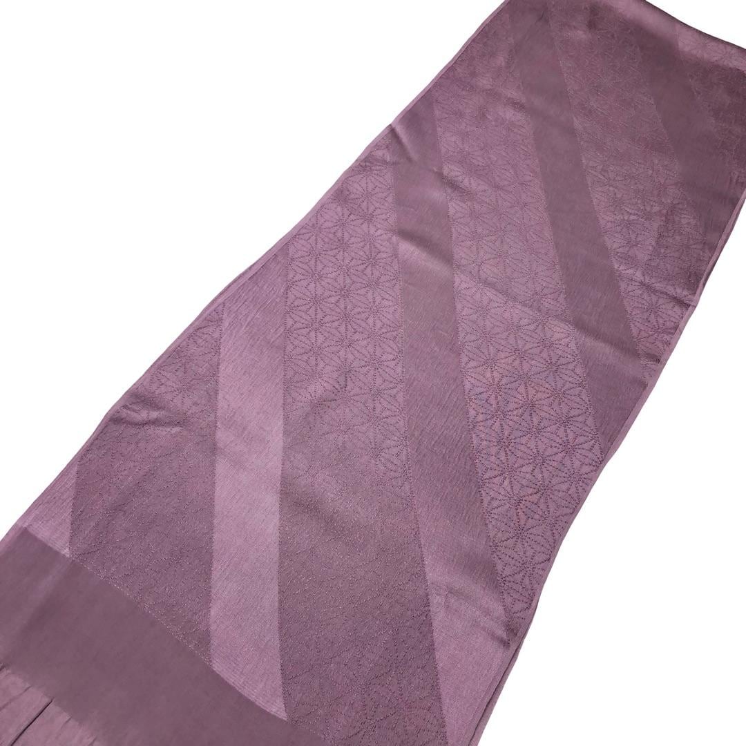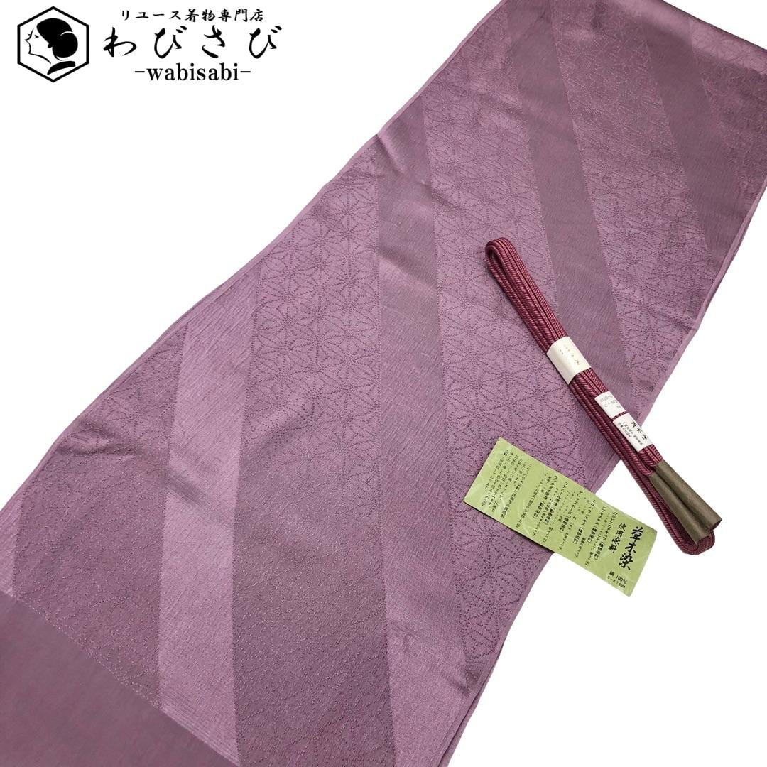 鳩羽色のお色味に麻の葉模様がデザインされた帯揚げ、冠組の帯締めの素敵なお品でございます。
