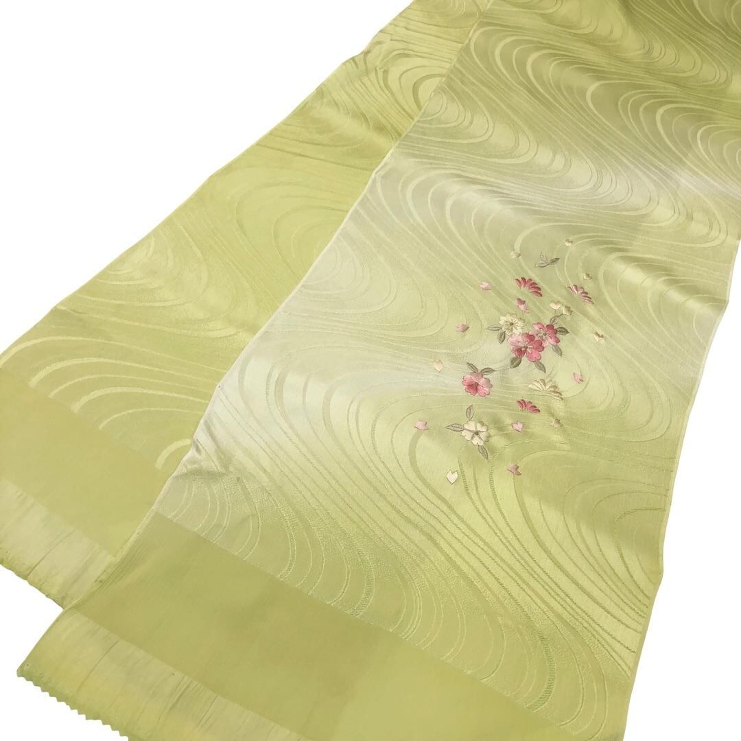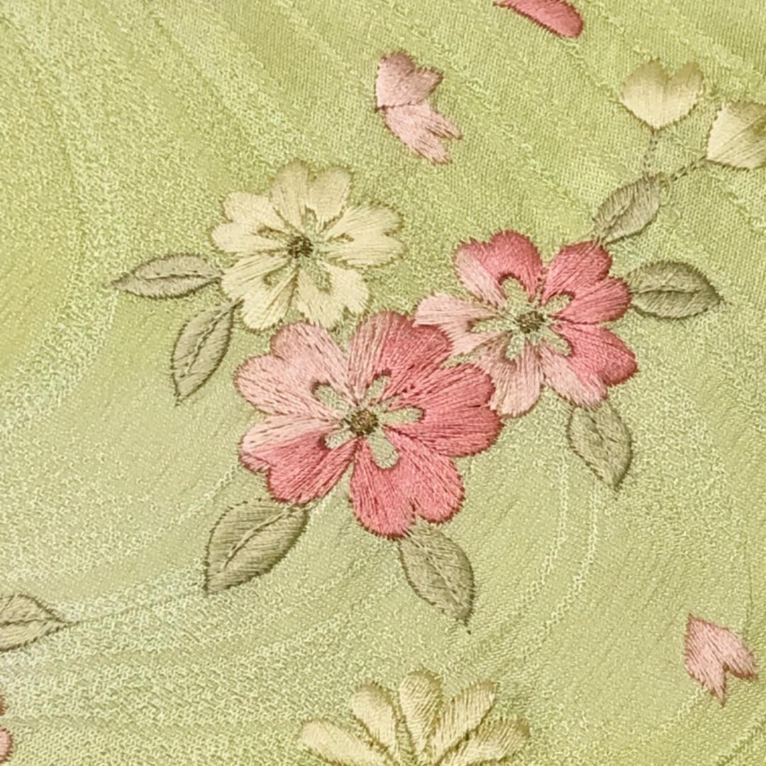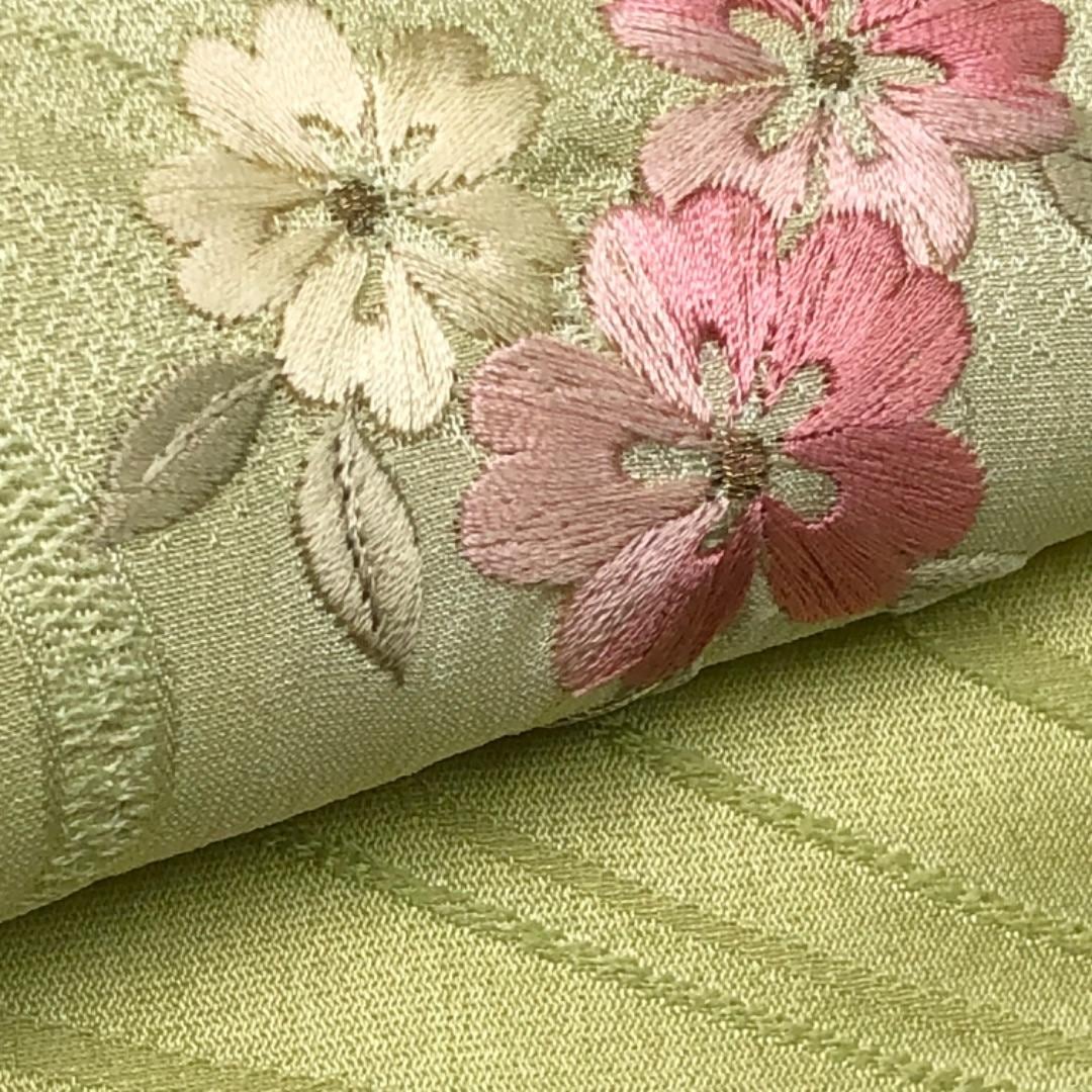 薄柳色のお色味に刺繍で花模様がデザインされた綸子の帯揚げ、平組紐の帯締めの素敵なお品でございます。