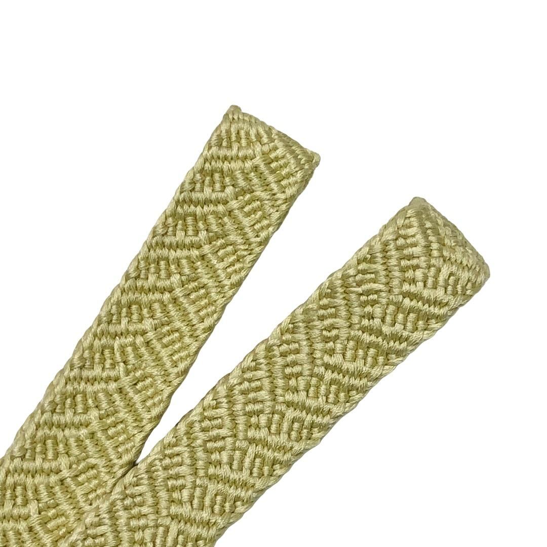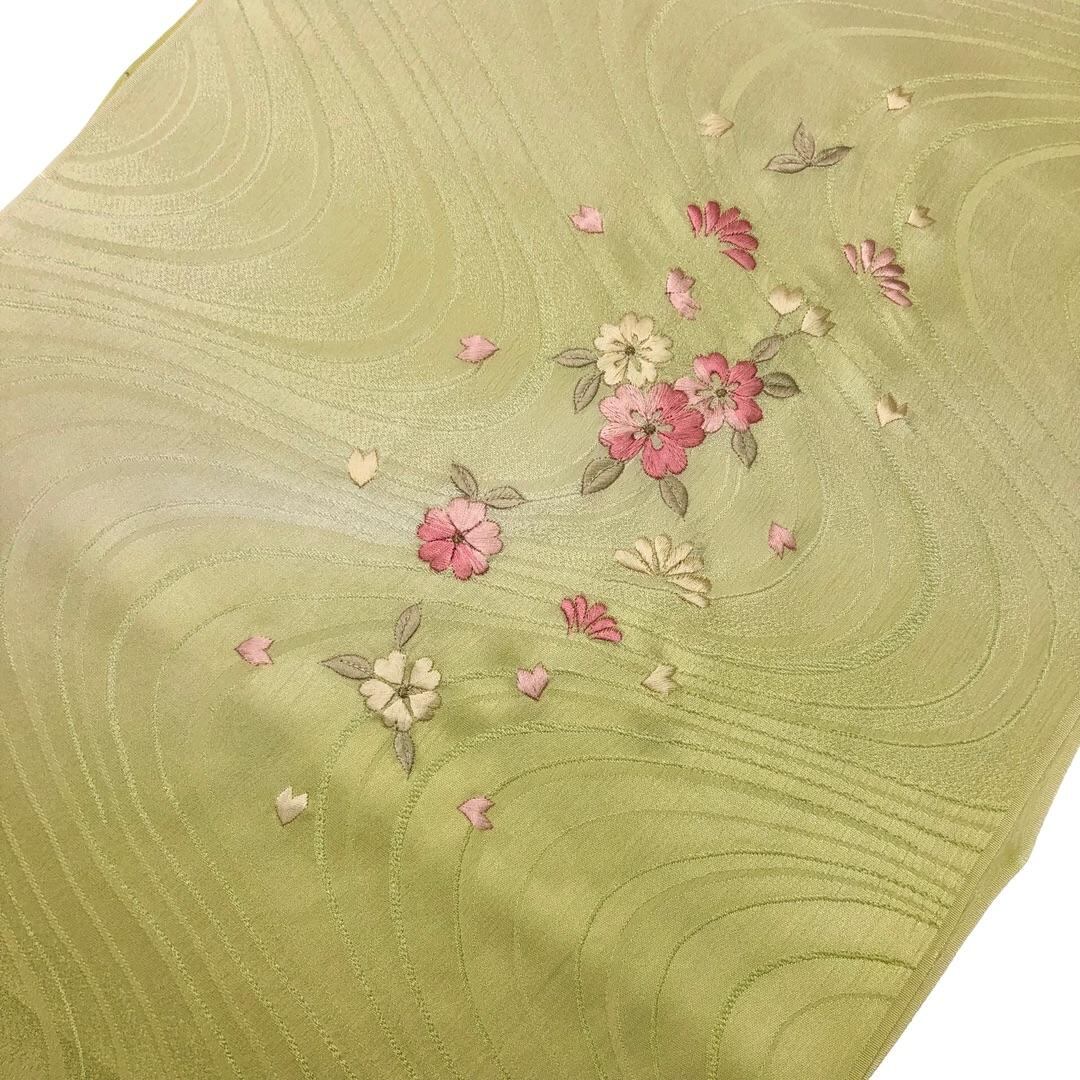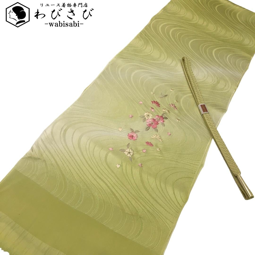 薄柳色のお色味に刺繍で花模様がデザインされた綸子の帯揚げ、平組紐の帯締めの素敵なお品でございます。