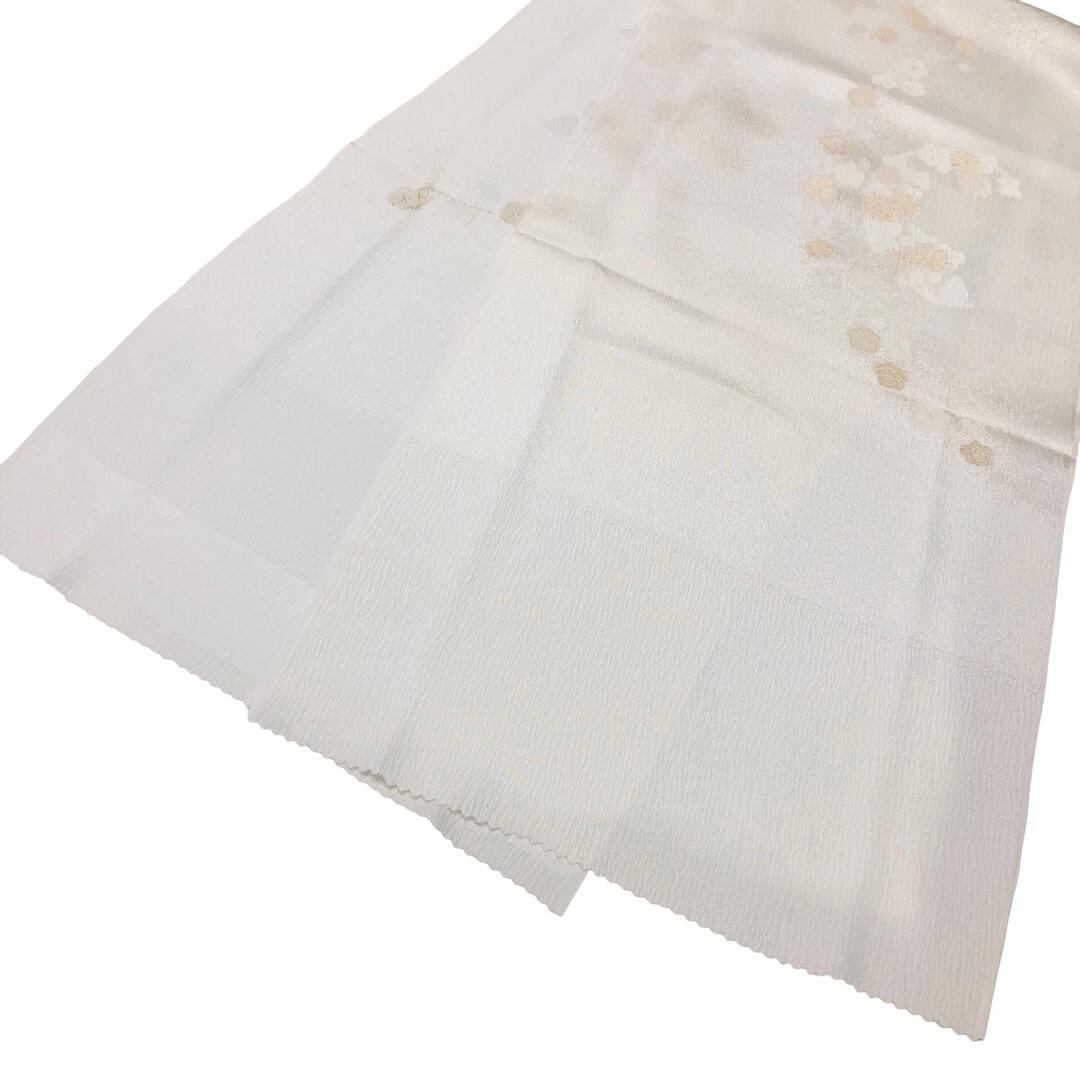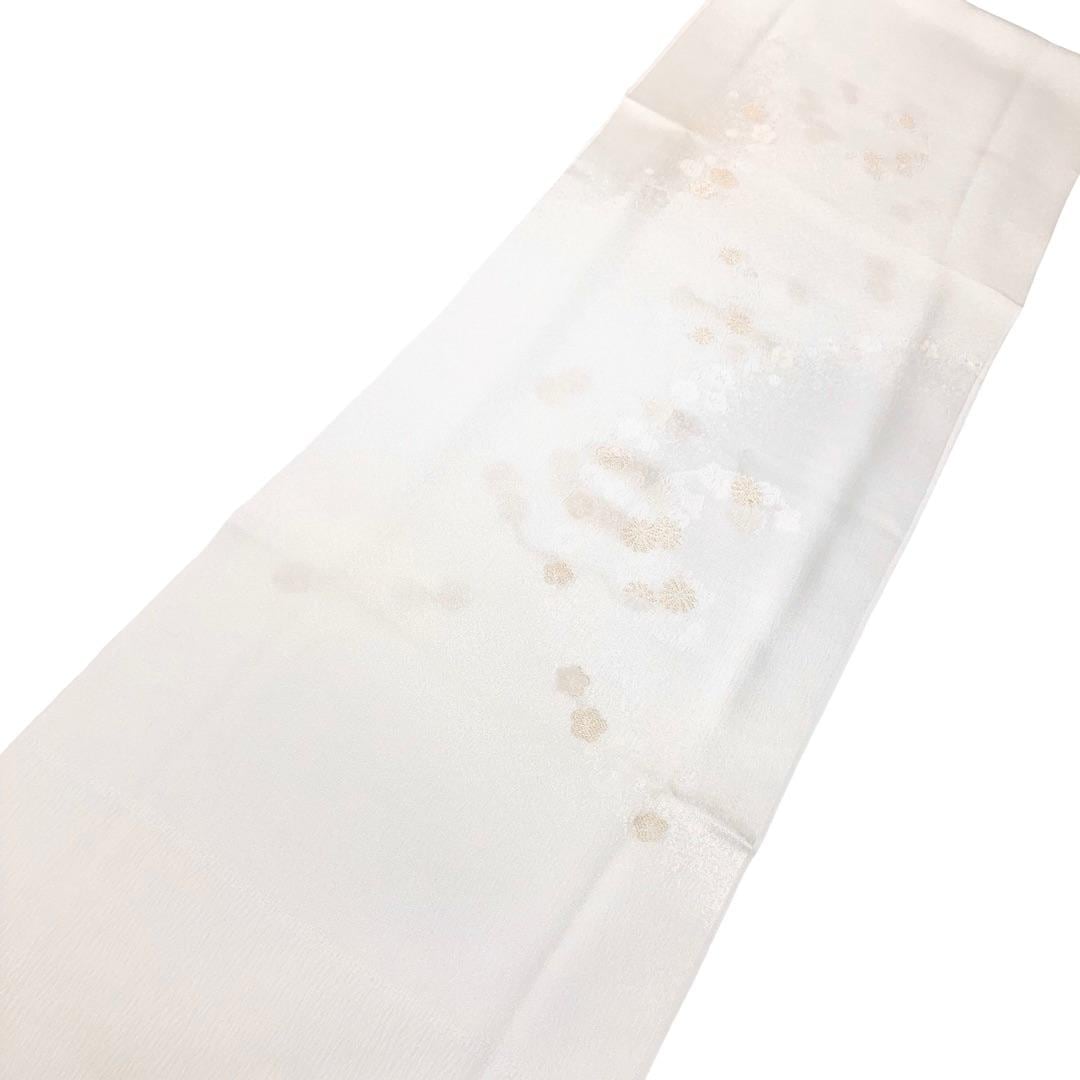 乳白色のお色味に花模様がデザインされた帯揚げ、高麗組の素敵なお品でございます。