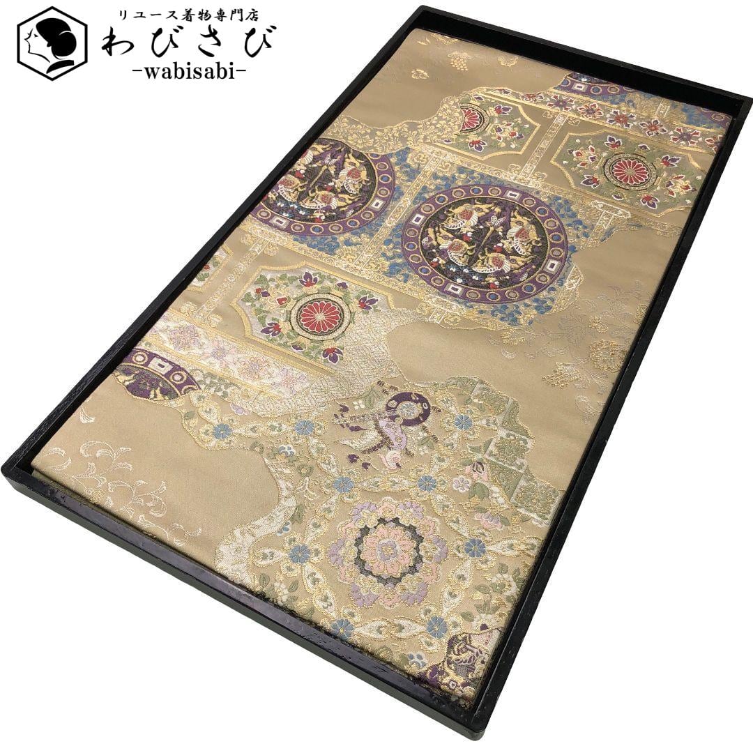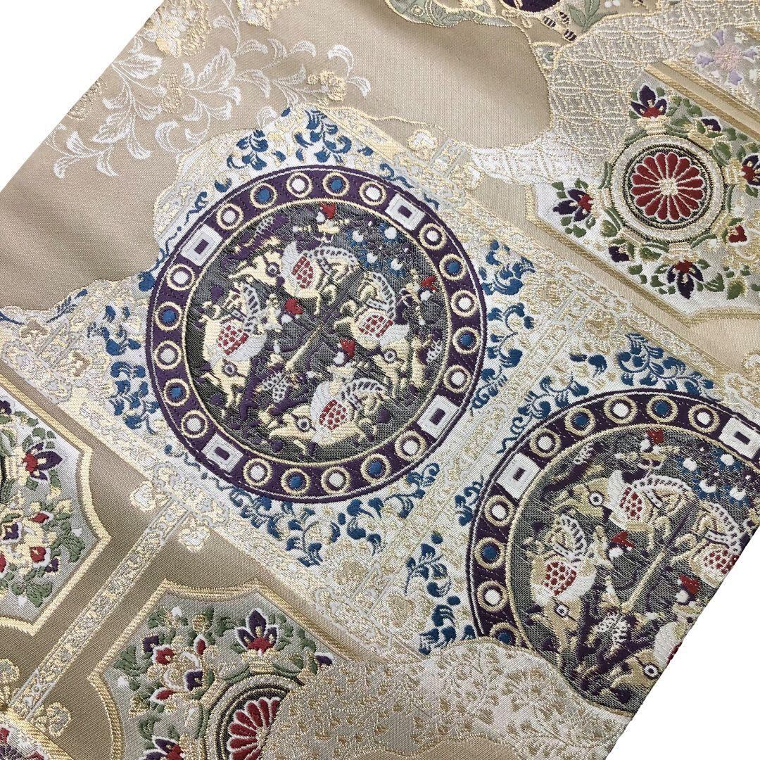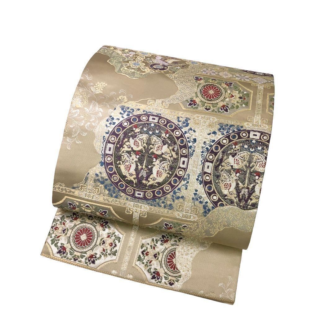 袋帯 西城麗華文 華模様 馬 鳥 金糸 枯野色 O-5974 着物 きもの kimono 和服 和装 中古 リサイクル着物 【送料無料】