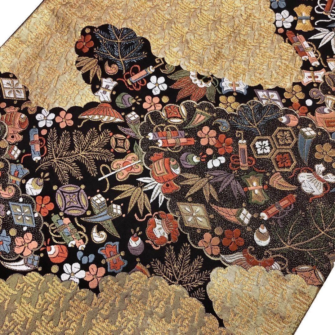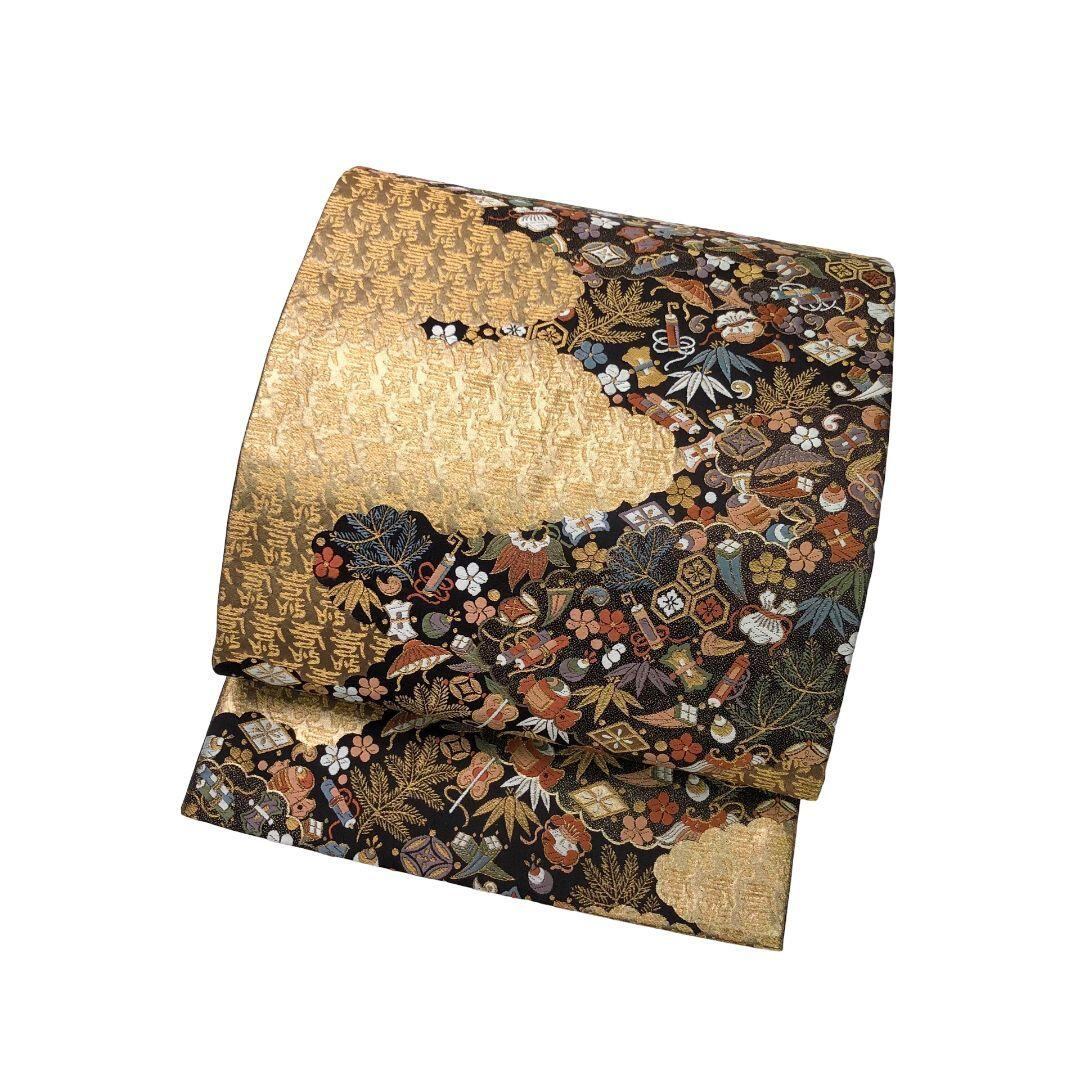 袋帯 宝尽くし 雲取り 寿文字 金糸 涅色 O-5989 着物 きもの kimono 和服 和装 中古 リサイクル着物 【送料無料】