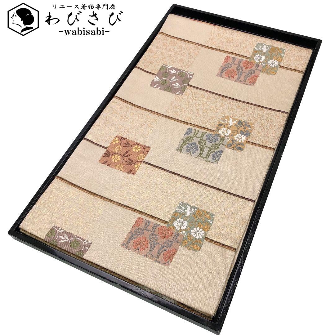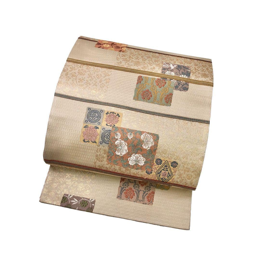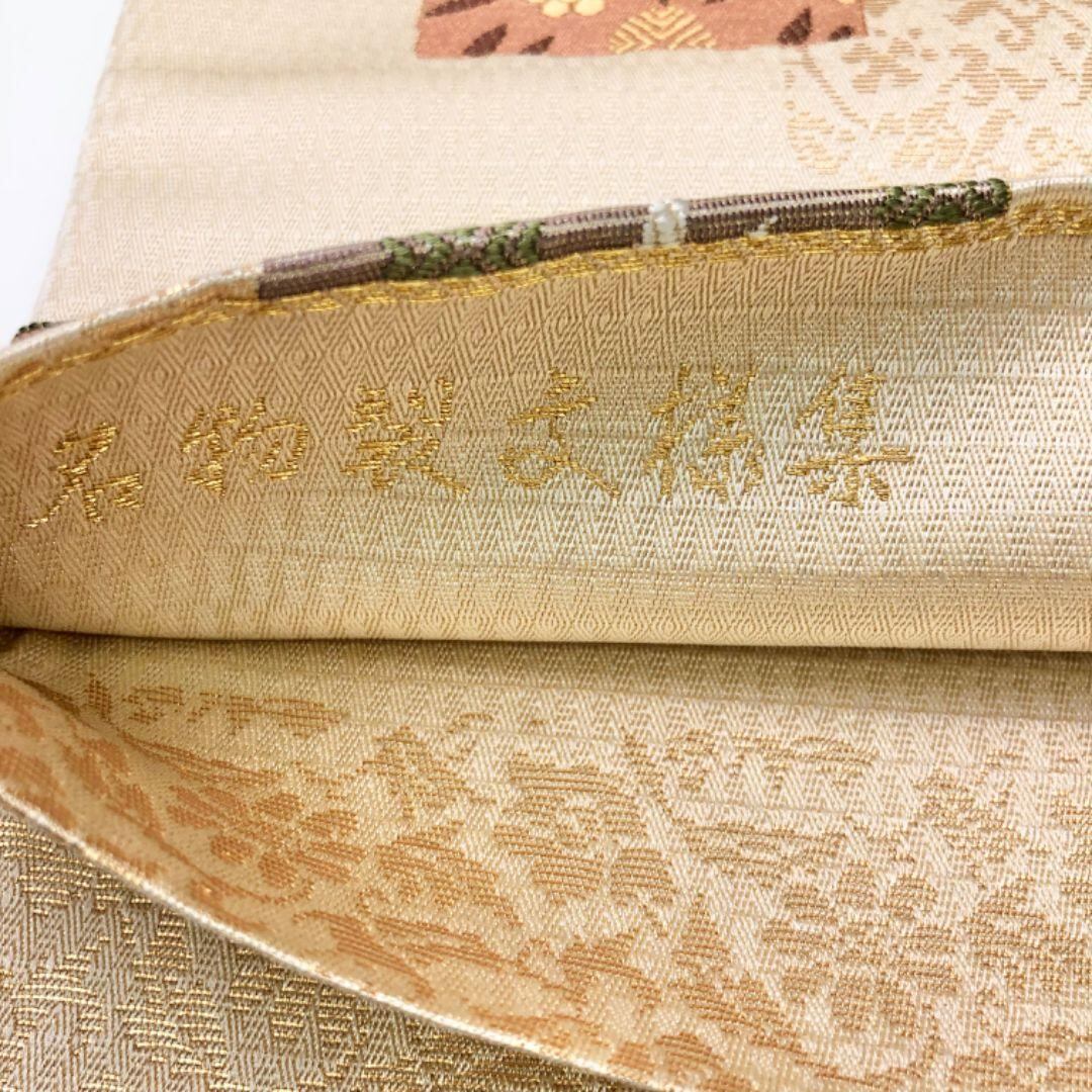 袋帯 名物裂文様集 四角に花唐草模様 金糸 鳳凰 生成色 O-6001 着物 きもの kimono 和服 和装 中古 リサイクル着物 【送料無料】