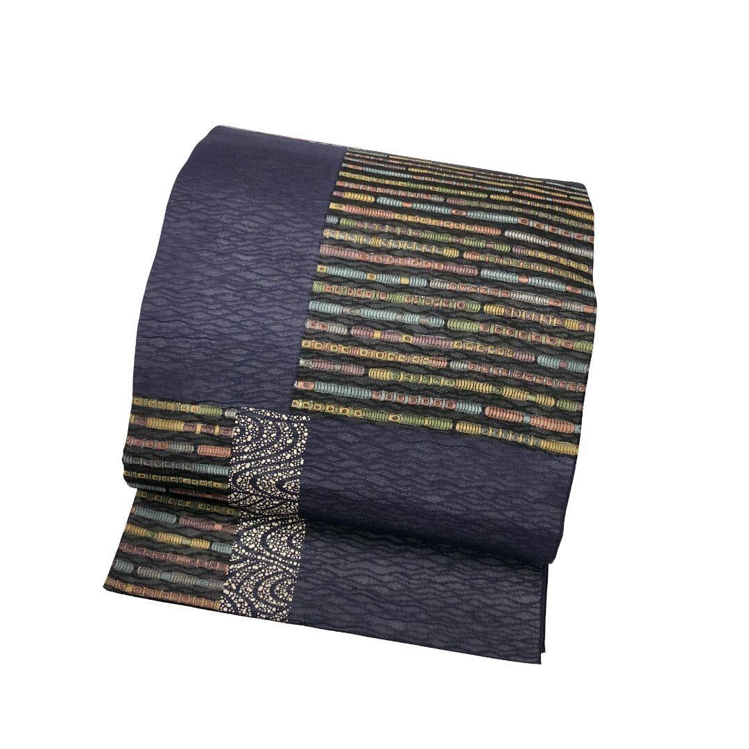 鉄葡萄色の雰囲気の良いお色味のすくい織、四角に横柄模様がデザインされた素敵なお品でございます。