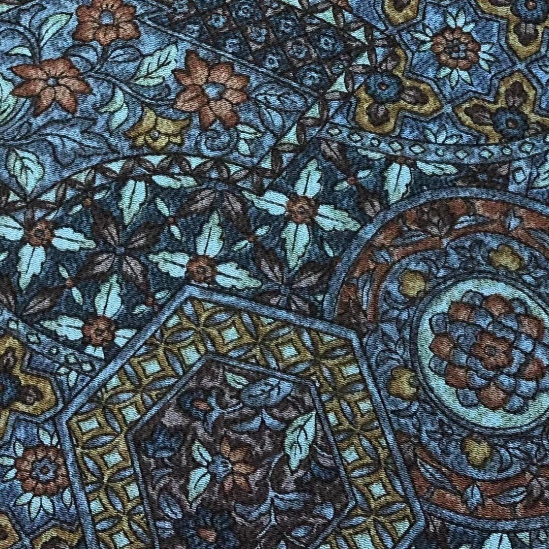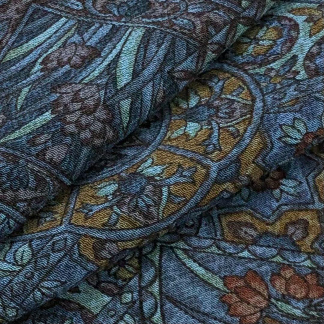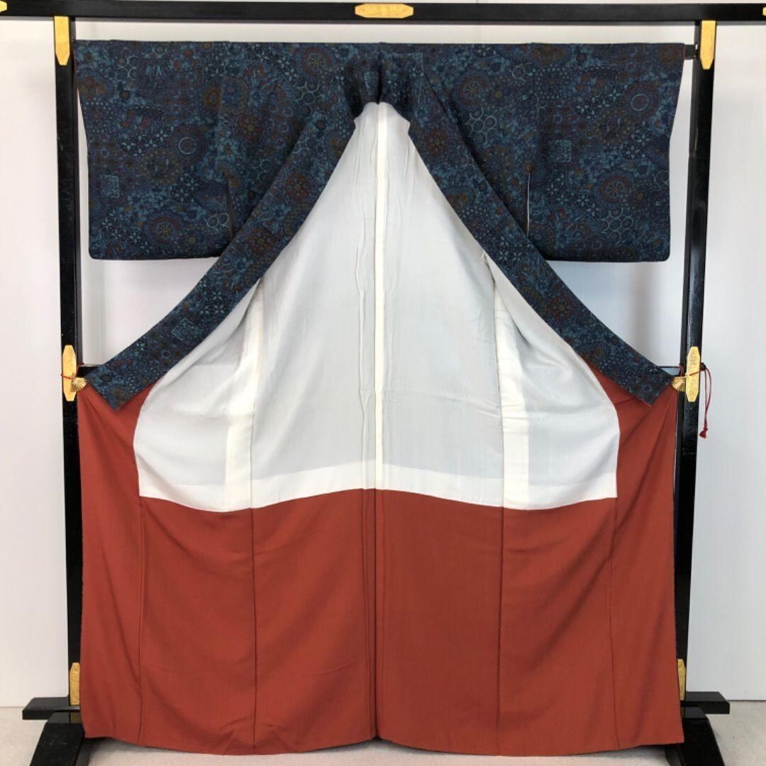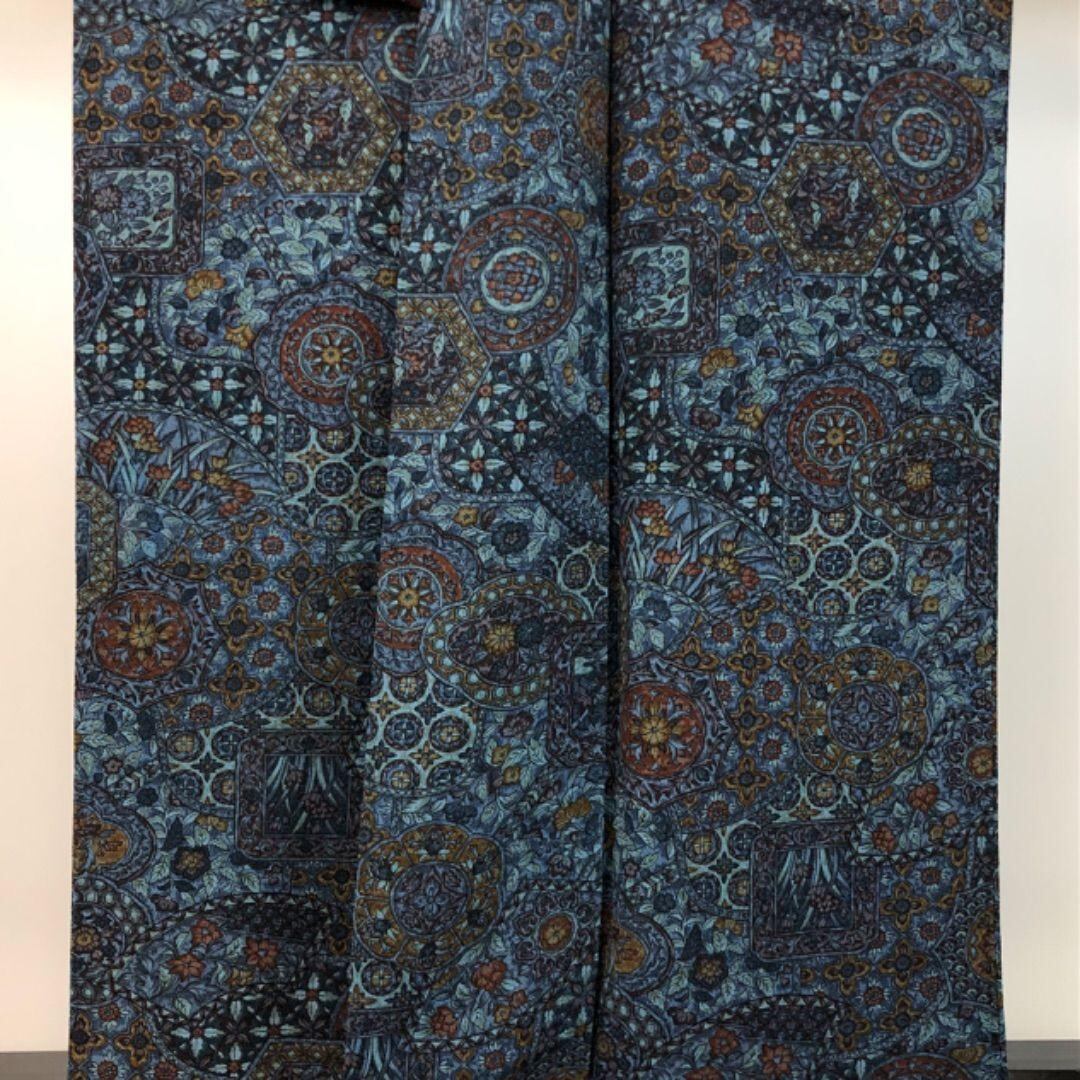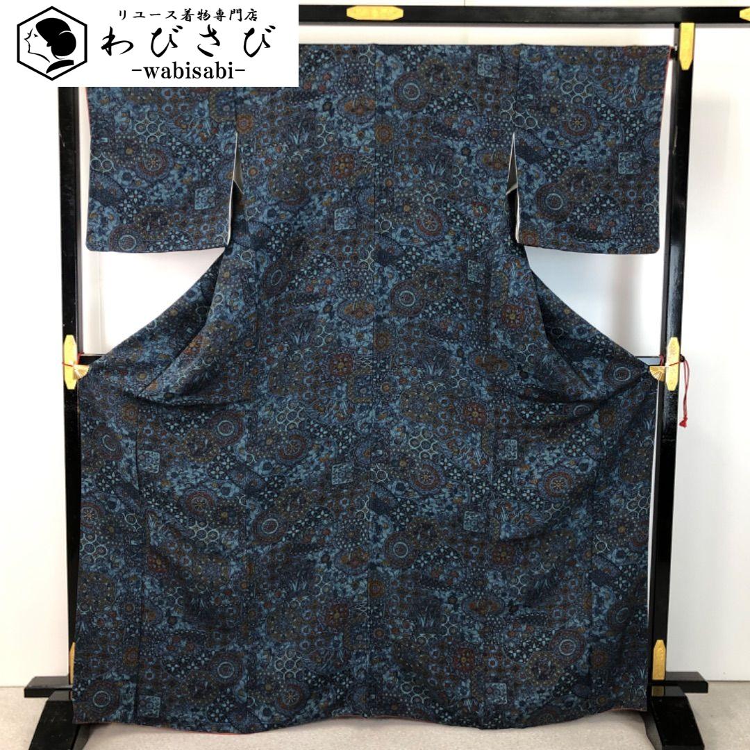 濃花色ベースの落ち着いた青系のお色味、縮緬地に華柄模様がデザインされた雰囲気の良い素敵なお品でございます。