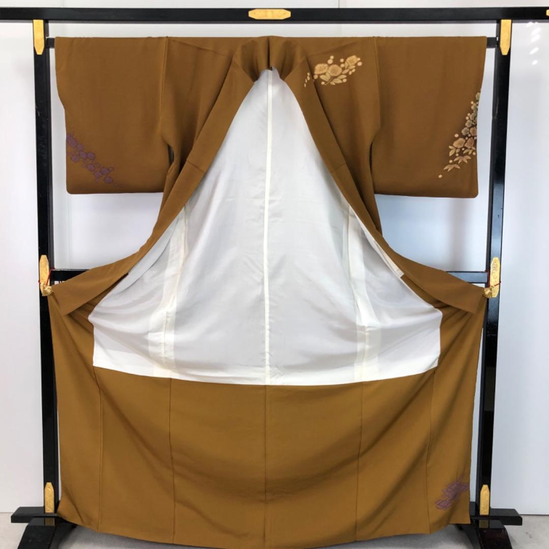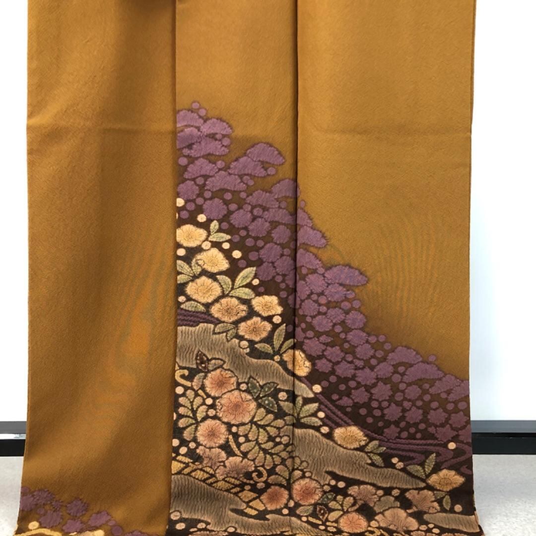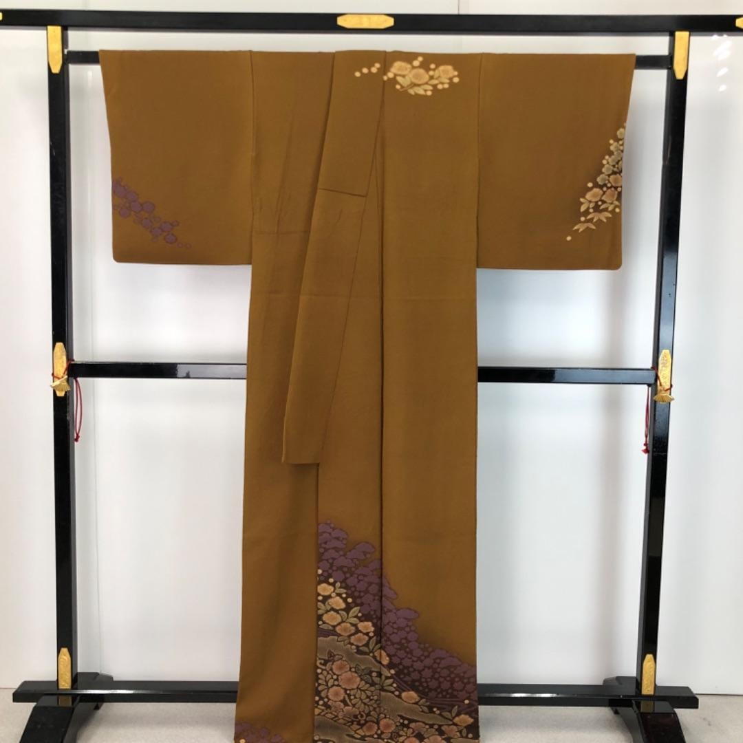 黄褐色の落ち着きのあるお色味の縮緬に美しい辻が花絞りの柄裄がデザインされた雰囲気の良い素敵なお品でございます。