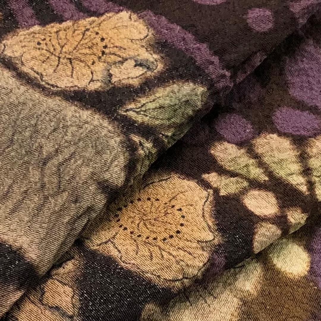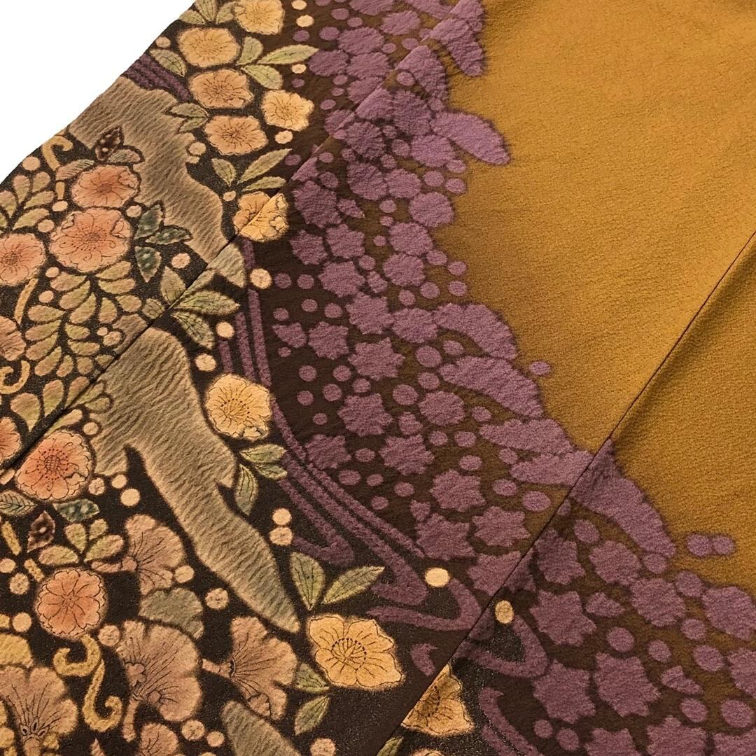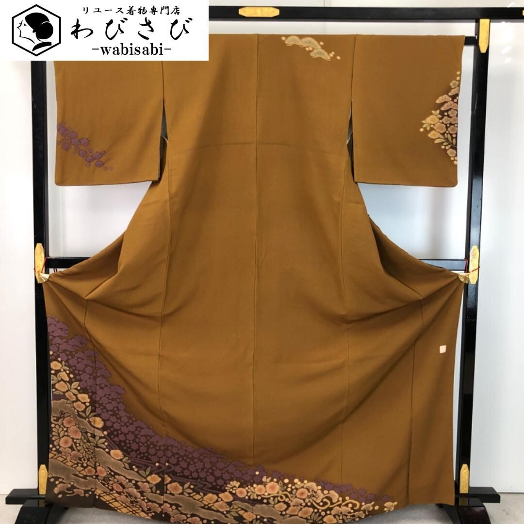黄褐色の落ち着きのあるお色味の縮緬に美しい辻が花絞りの柄裄がデザインされた雰囲気の良い素敵なお品でございます。