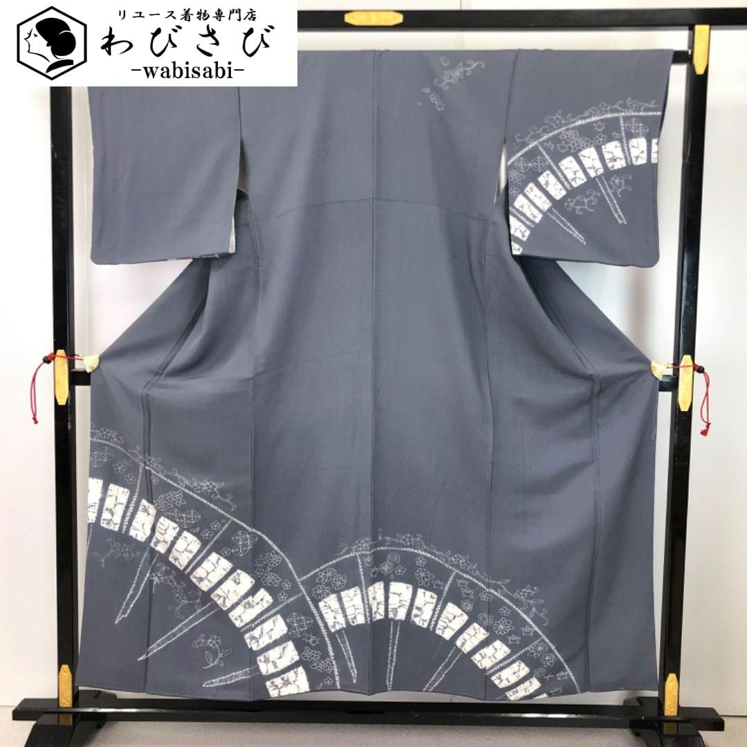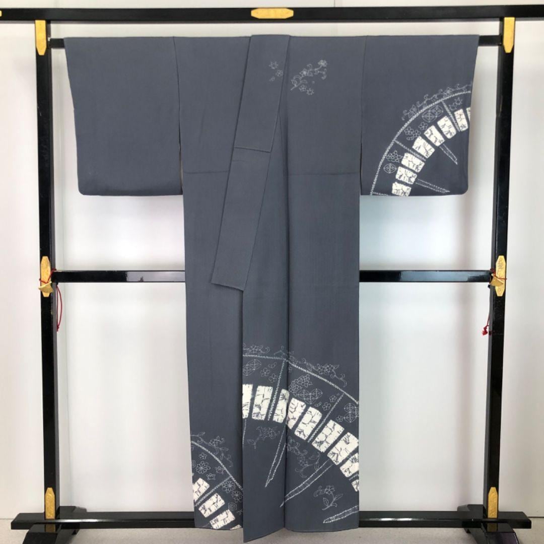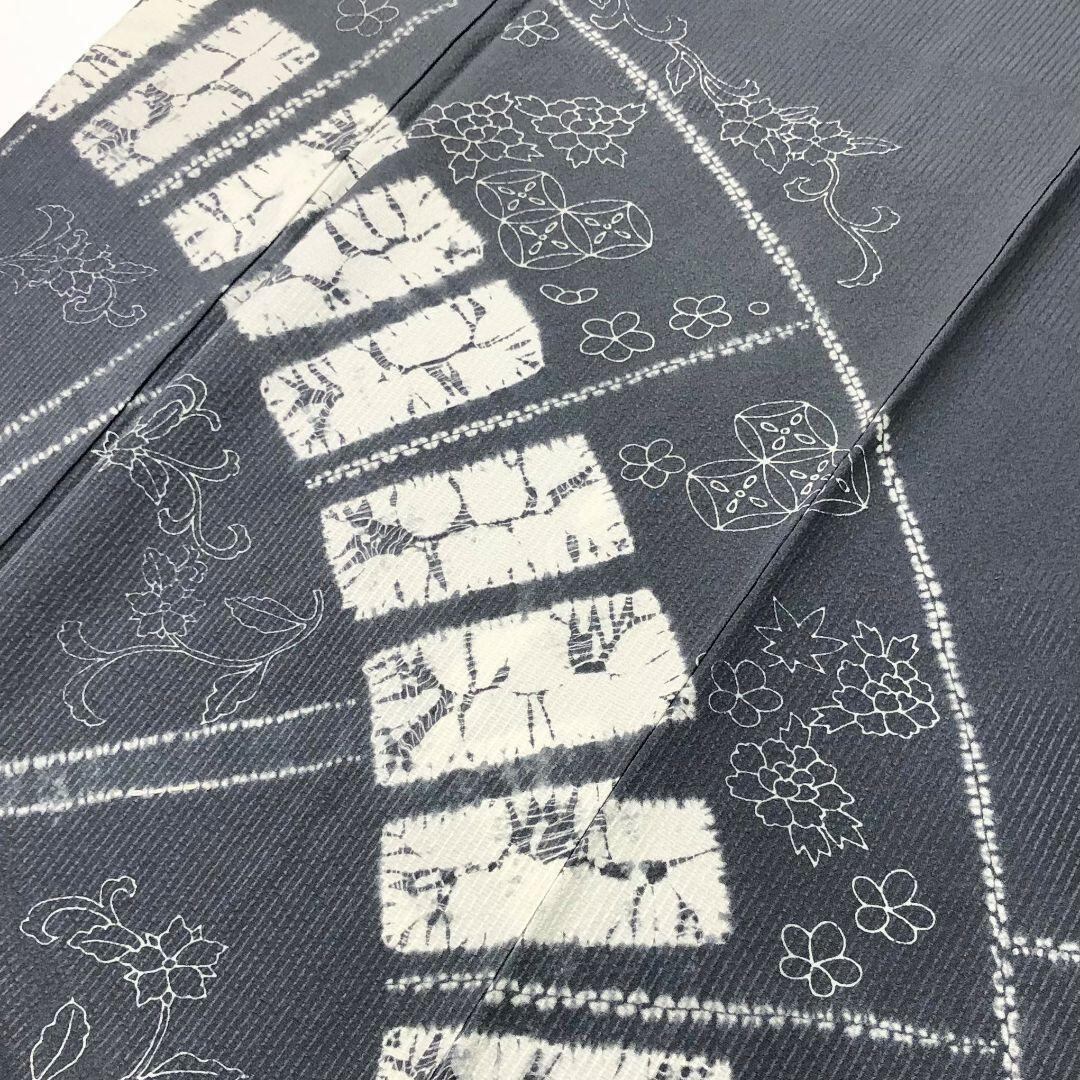 鉛色の落ち着きのある灰青味のお色に絞り柄、七宝、花柄、花唐草などの柄裄がデザインされた素敵なお品でございます。