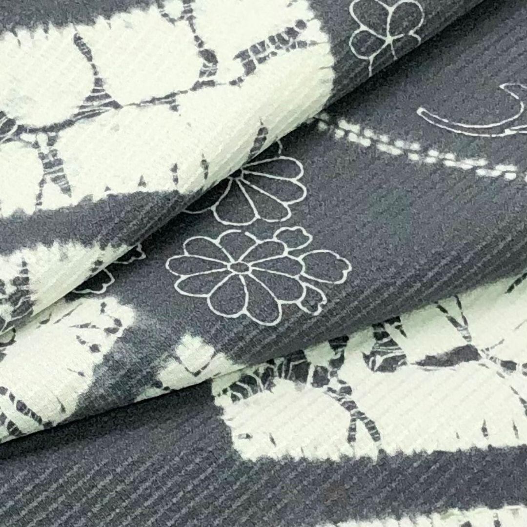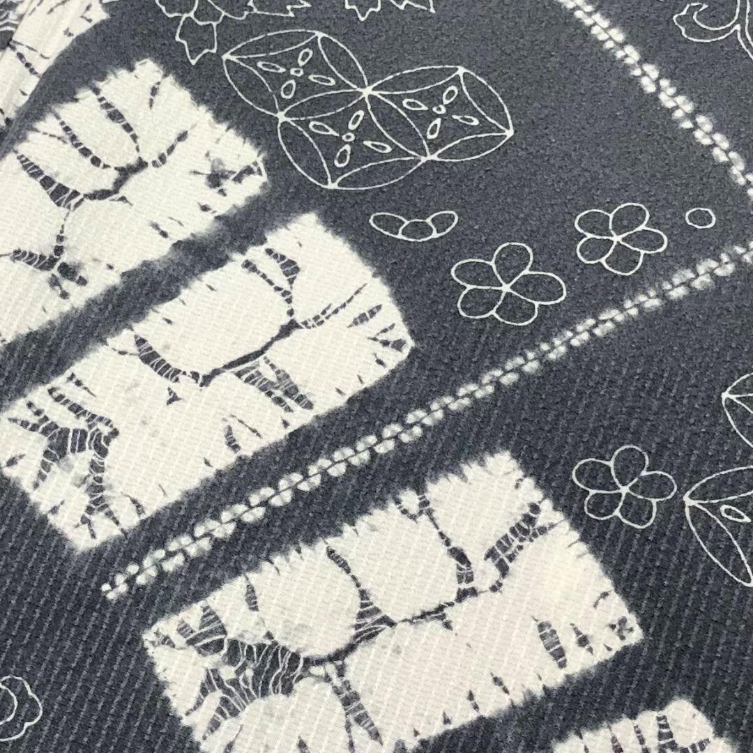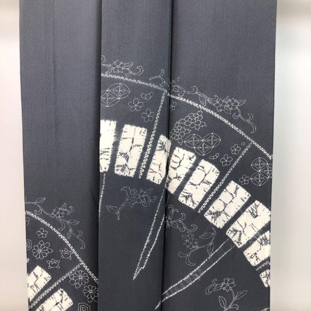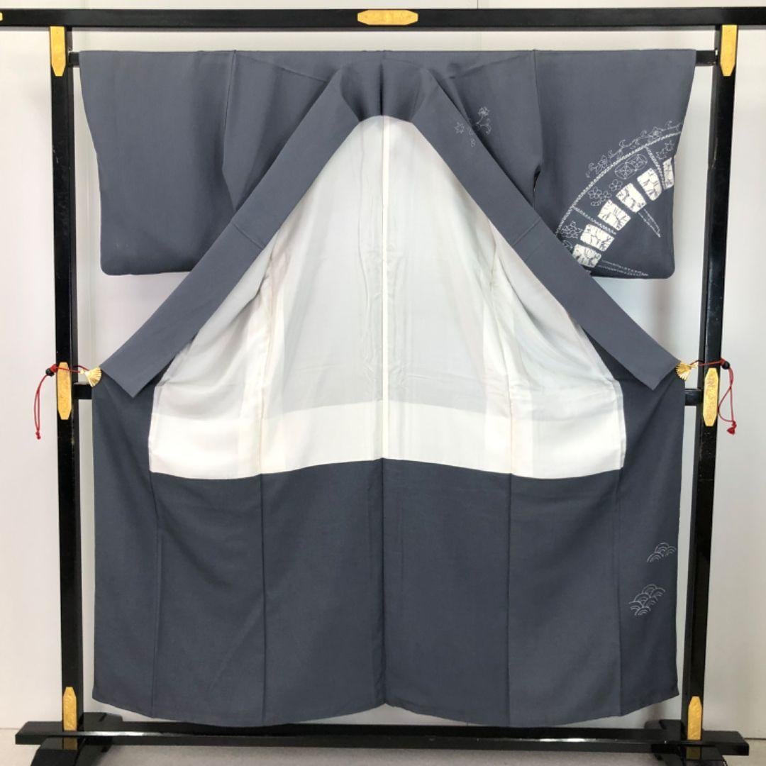 鉛色の落ち着きのある灰青味のお色に絞り柄、七宝、花柄、花唐草などの柄裄がデザインされた素敵なお品でございます。