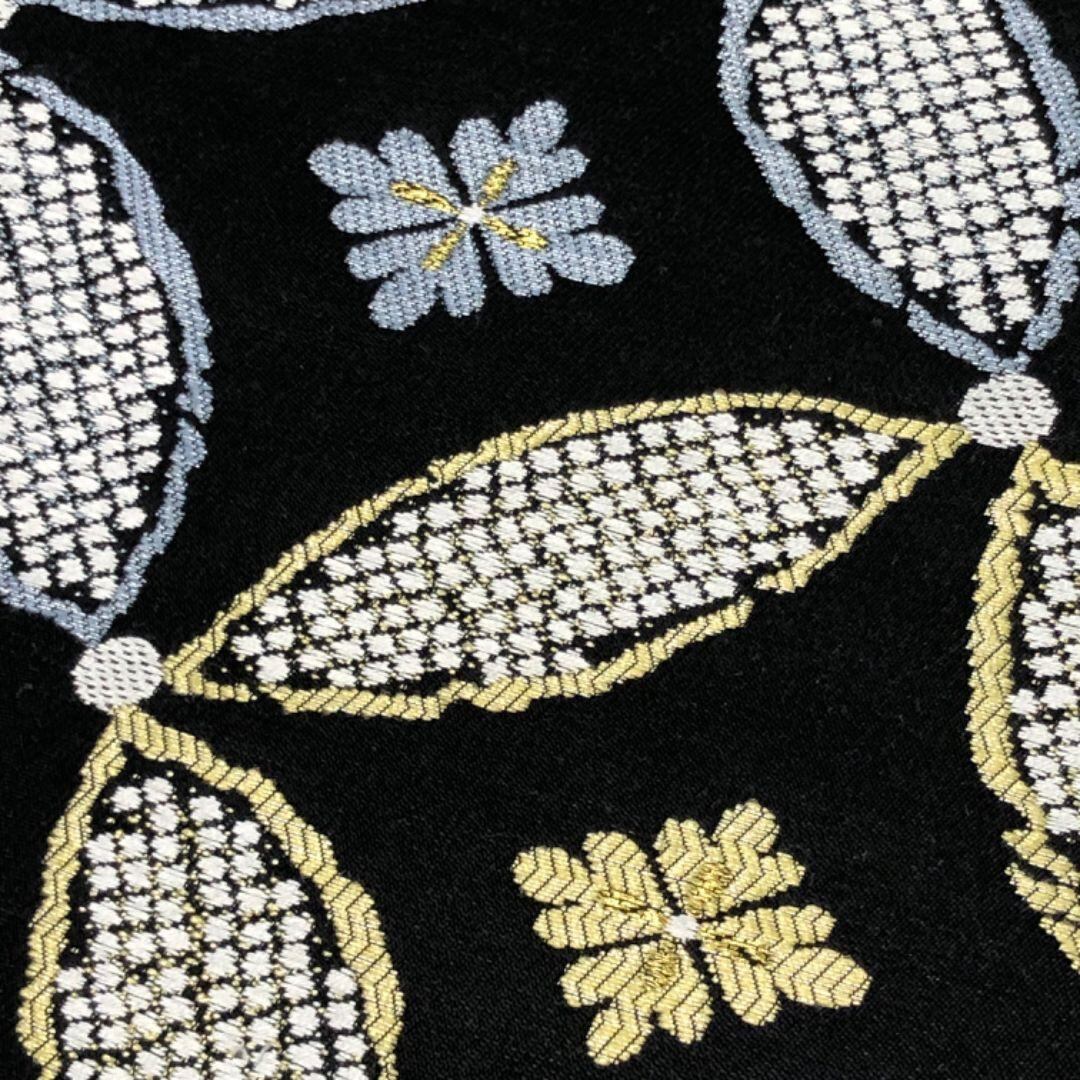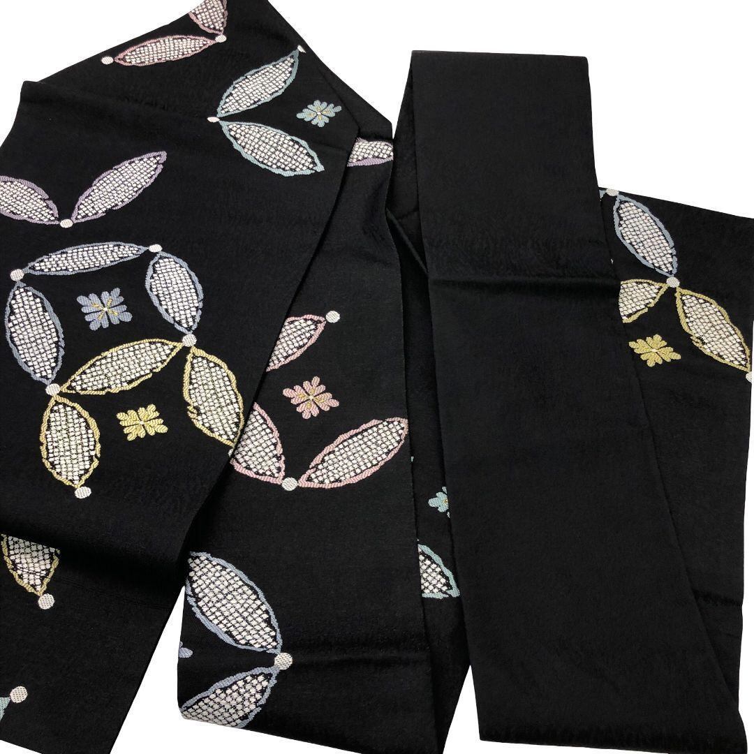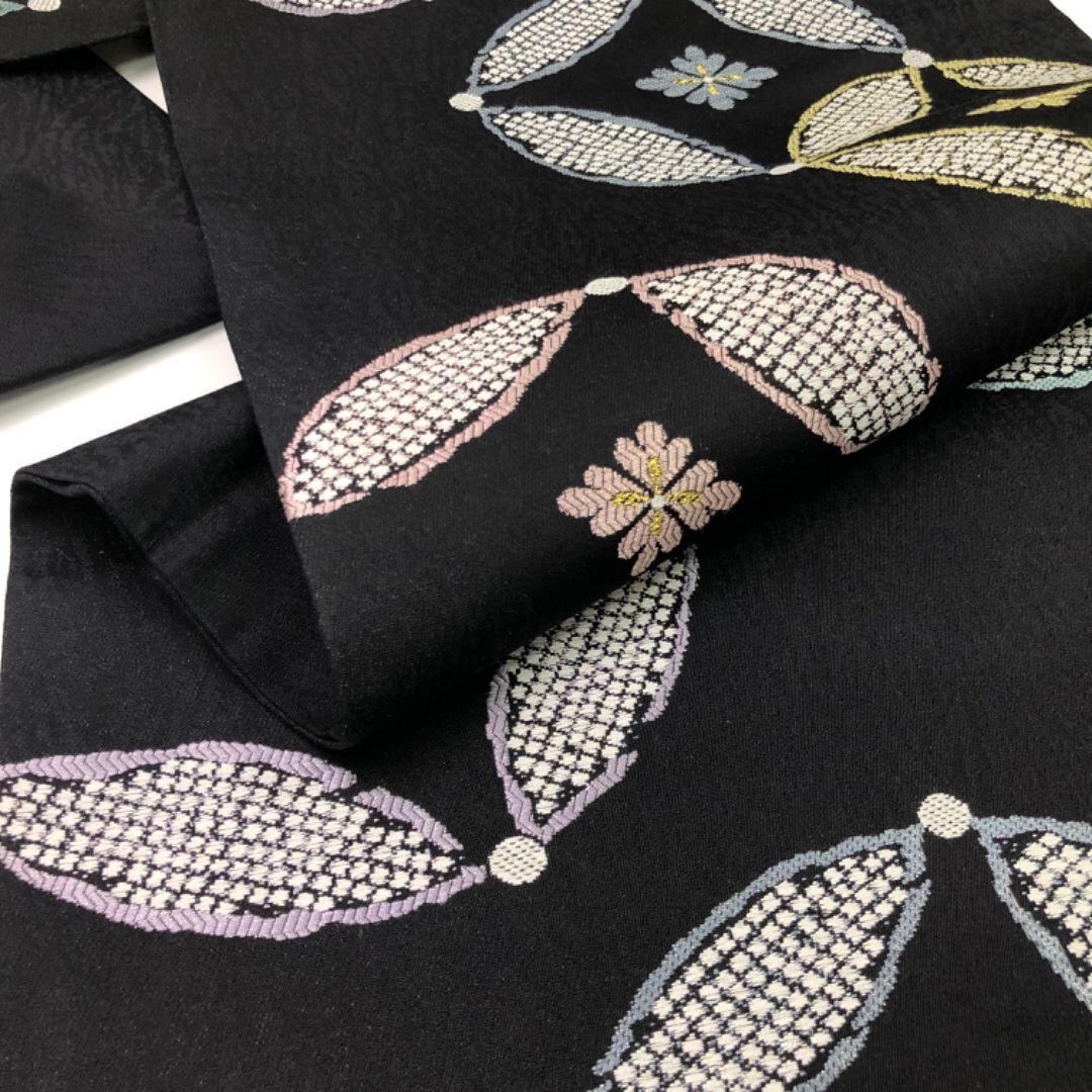 黒色のお色味に花七宝の柄行がデザインされた雰囲気の良い素敵なお品でございます。