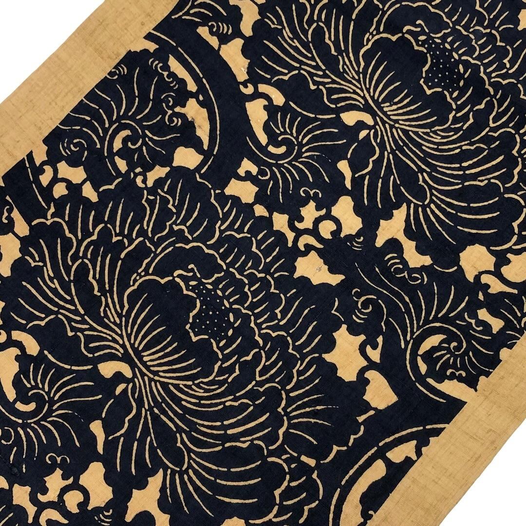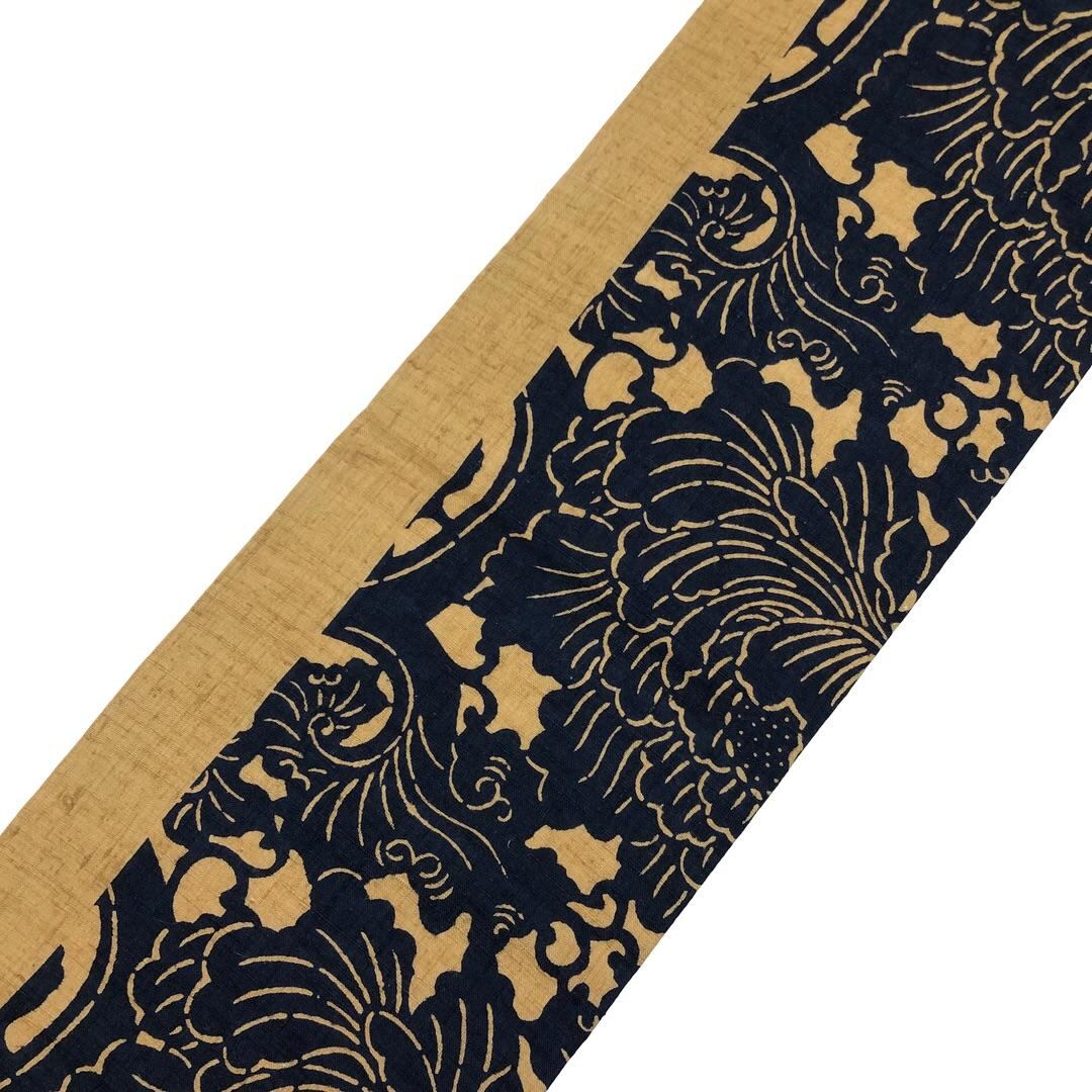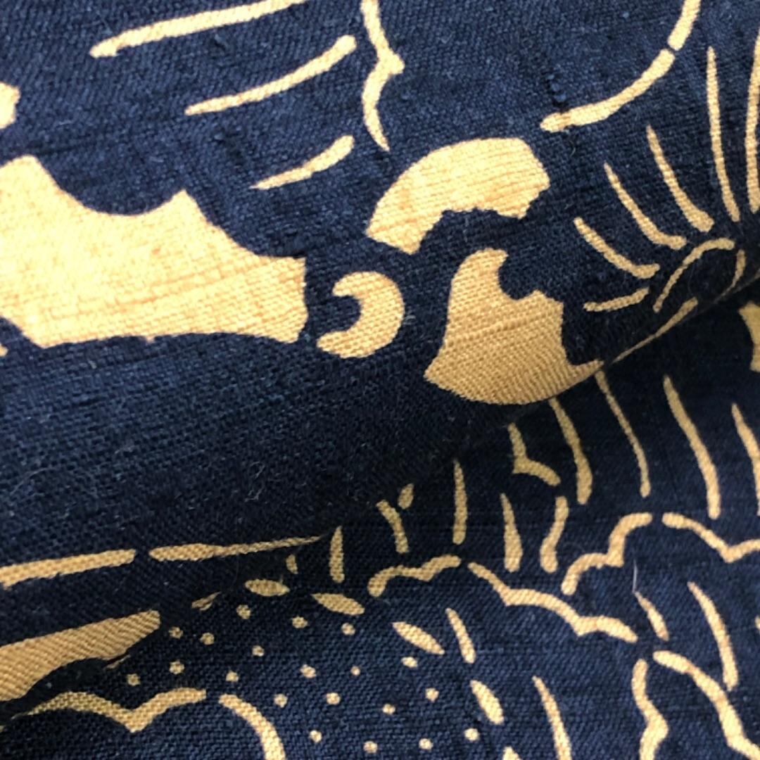 茅色の自然な風合いのお色味の紬地に雰囲気の良い藍色の花唐草模様の型染がデザインされた味わいのある素敵なお品でございます。