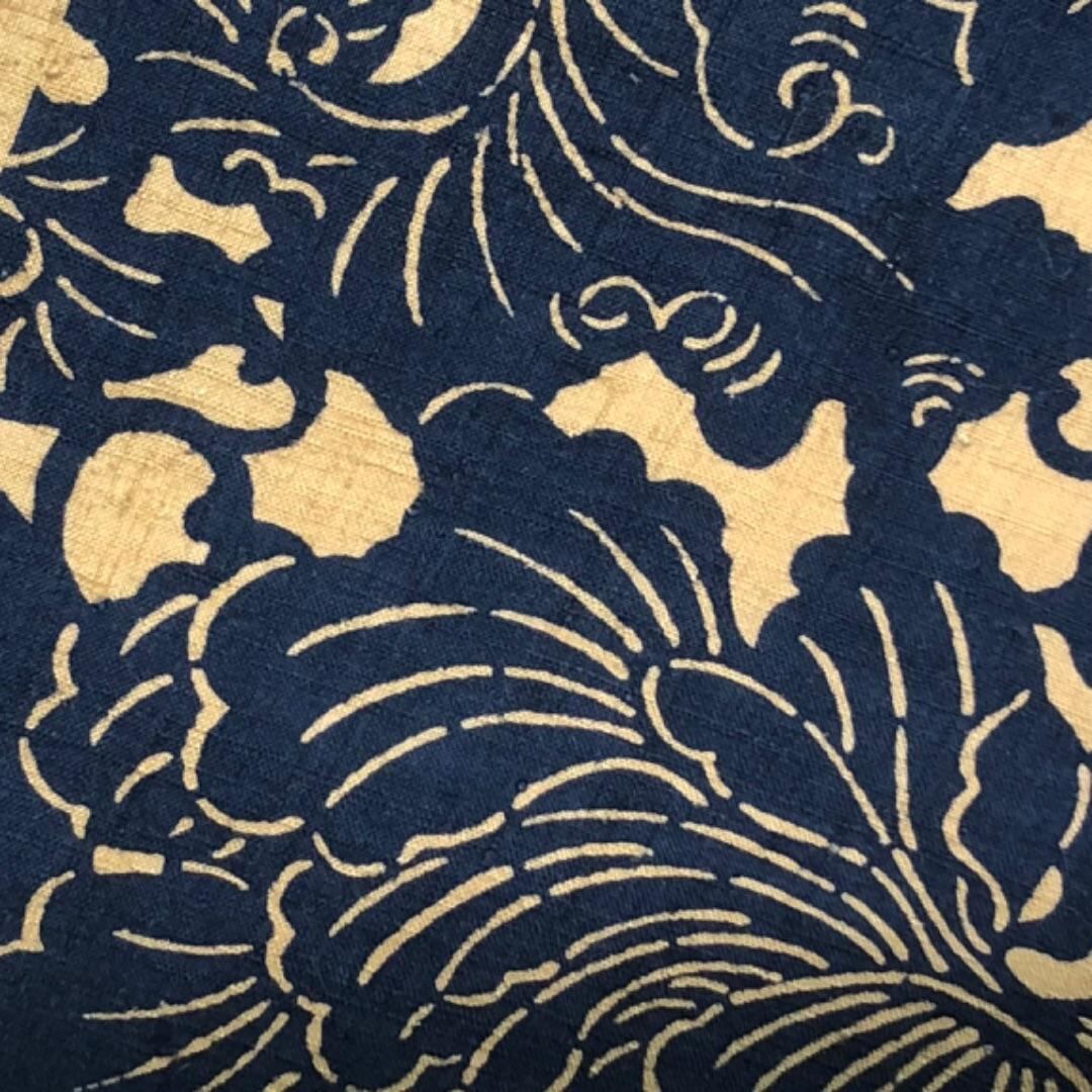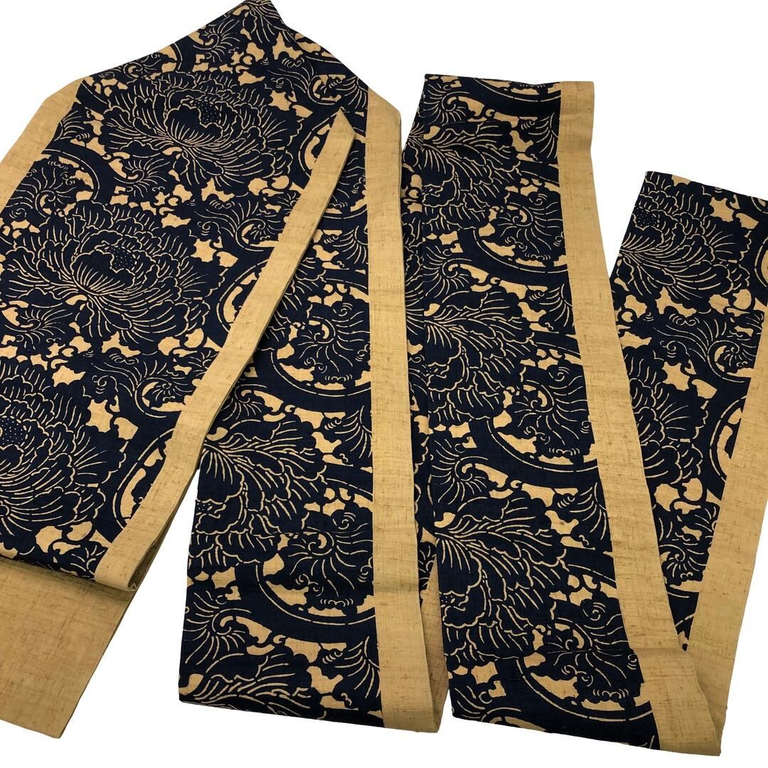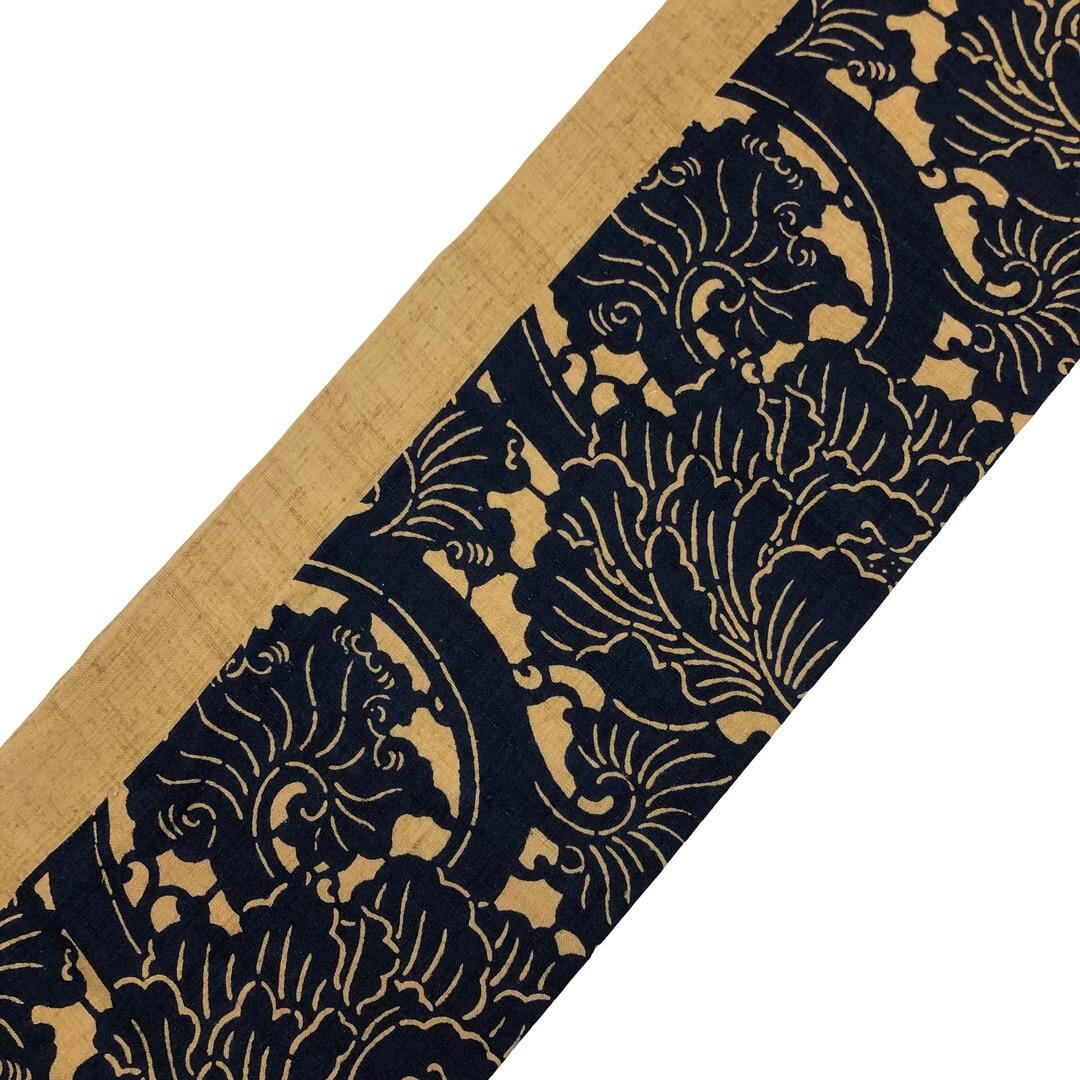 茅色の自然な風合いのお色味の紬地に雰囲気の良い藍色の花唐草模様の型染がデザインされた味わいのある素敵なお品でございます。
