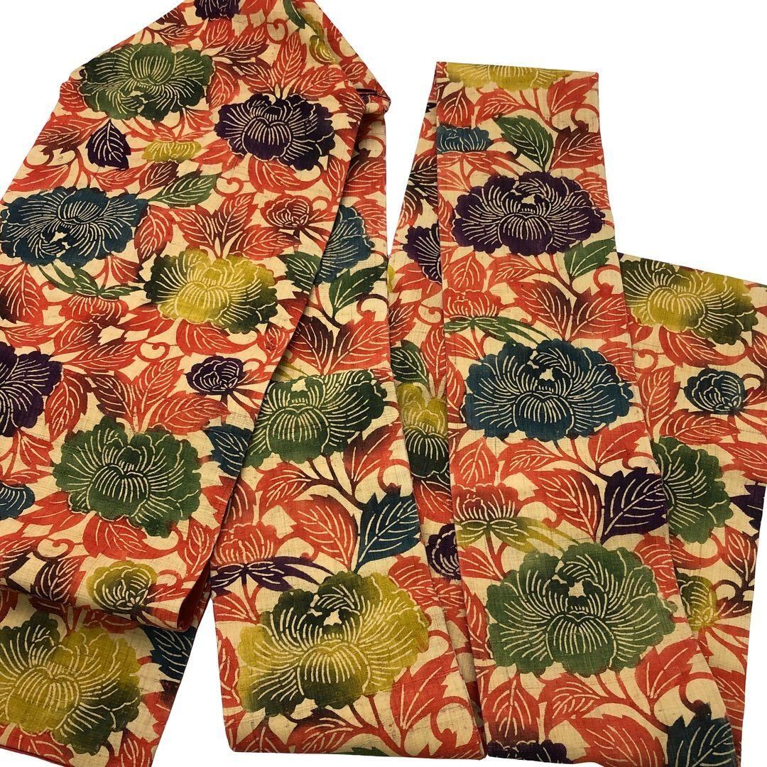 名古屋帯 型染 紬 花唐草模様 鳥の子色 O-6049 着物 きもの kimono 和服 和装 中古 リサイクル着物 【送料無料】