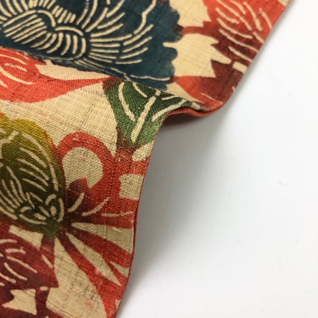 鳥の子色のお色味の紬地に雰囲気の良い花唐草模様がデザインされた味わいのある素敵な色彩のお品でございます。