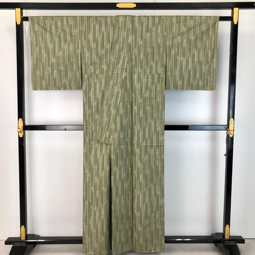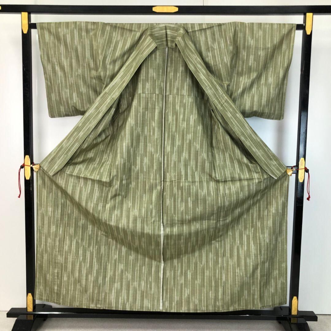 単衣 織宝つむぎ 縦柄模様 根岸色 しつけ糸 K-5739 着物 きもの kimono 和服 和装 中古 リサイクル着物 【送料無料】