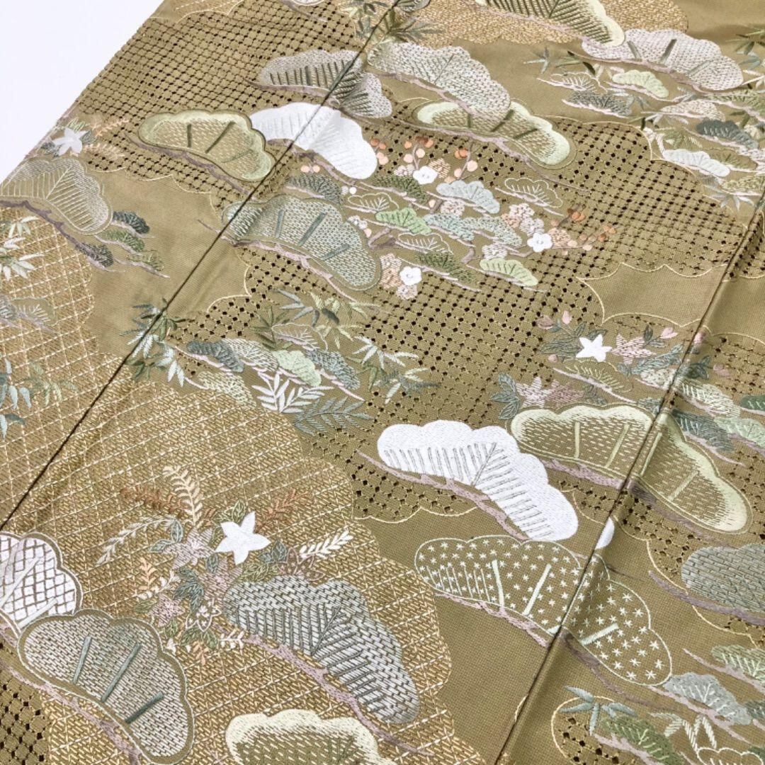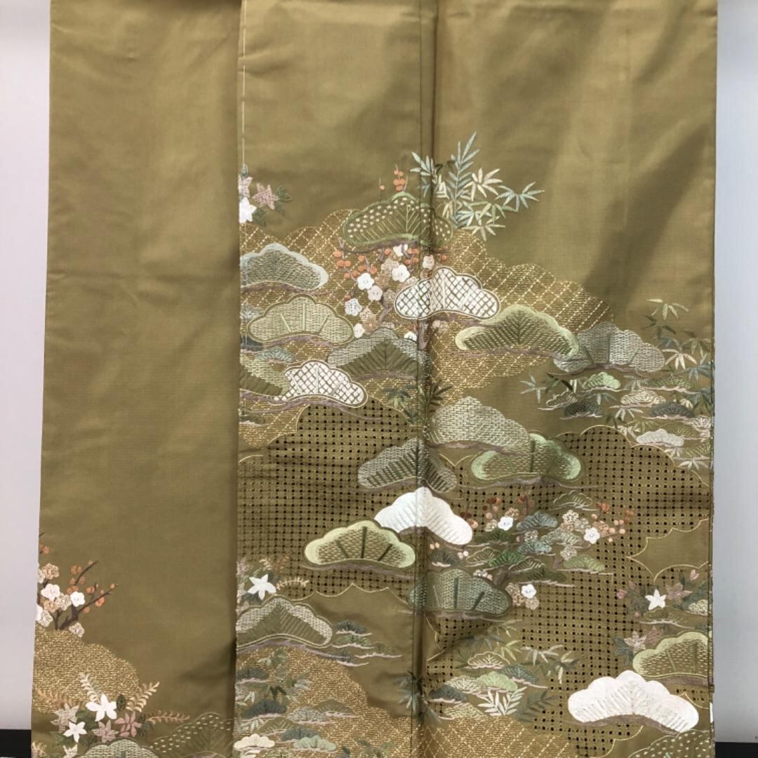訪問着 総刺繍 松に梅 汕頭刺繍 黄鼠色 しつけ糸 トールサイズ K-5788 着物 きもの kimono 和服 和装 中古 リサイクル着物 【送料無料】