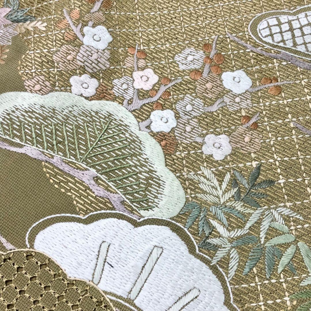 黄鼠色の品のあるお色味に汕頭刺繍などの総刺繍で松に梅の花模様などがデザインされた大変手のかかった素敵なお品でございます。